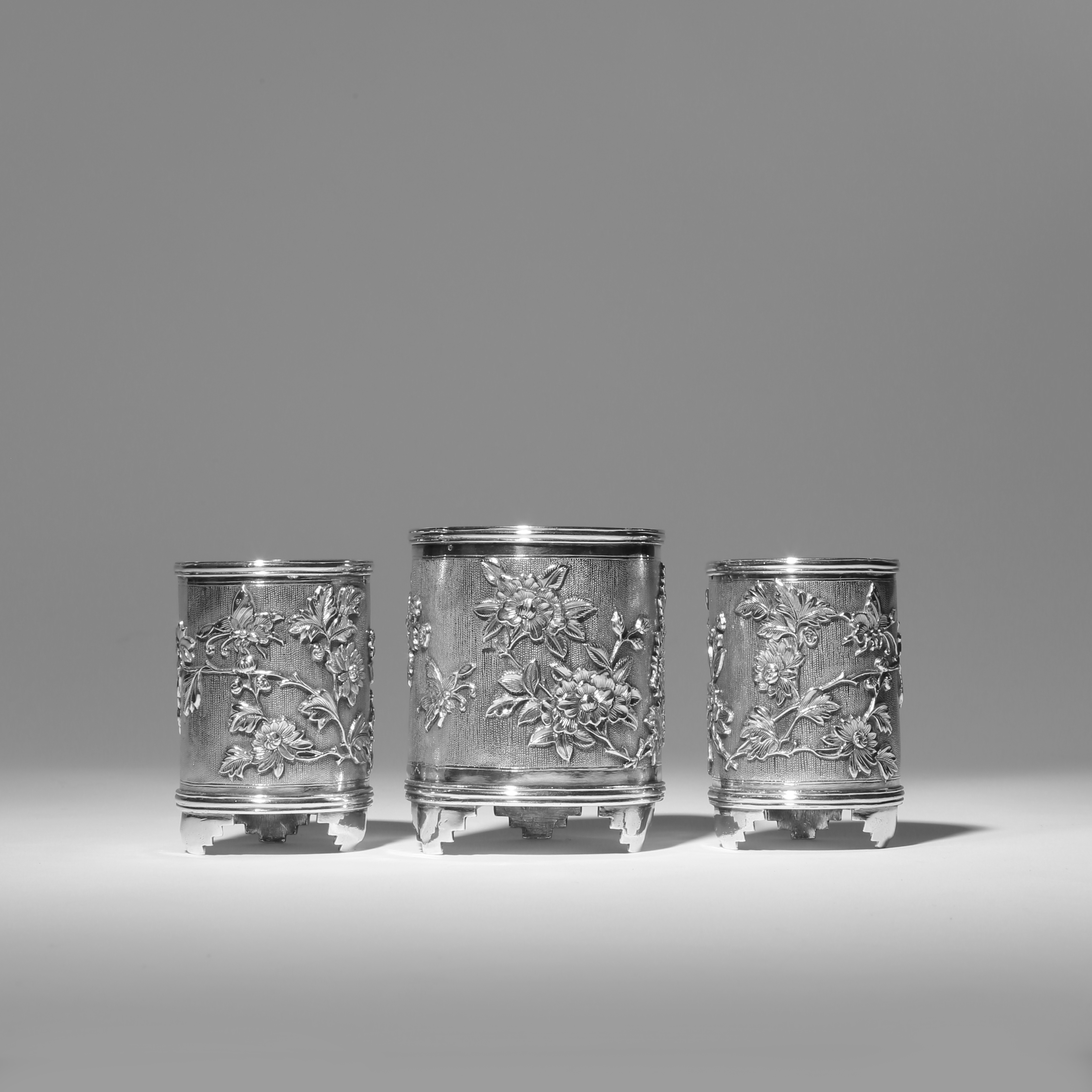 Decorated in relief with butterflies in flight amidst blossoming branches against a matted ground, each raised on three feet and with two punch marks to the base reading Jin Pin, the two smaller brushpots a pair, 7.9cm max, 100g, 68g and 66g. (3)