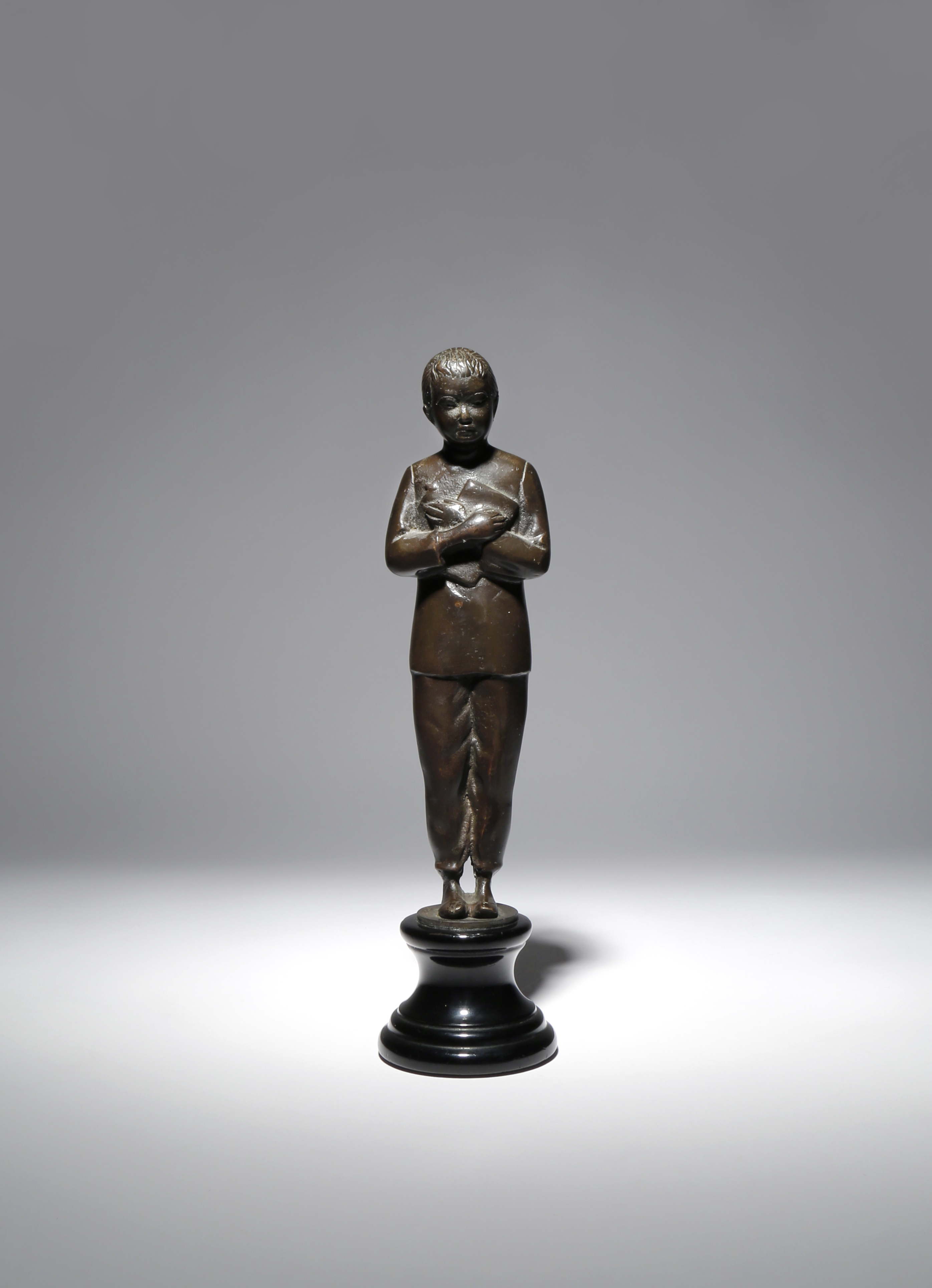 Depicted standing dressed in simple clothes, she bears a sincere expression on her face as she clutches a book at her chest, with her hair braided in a long plait, attached to a stand, 23.4cm, 975g overall.