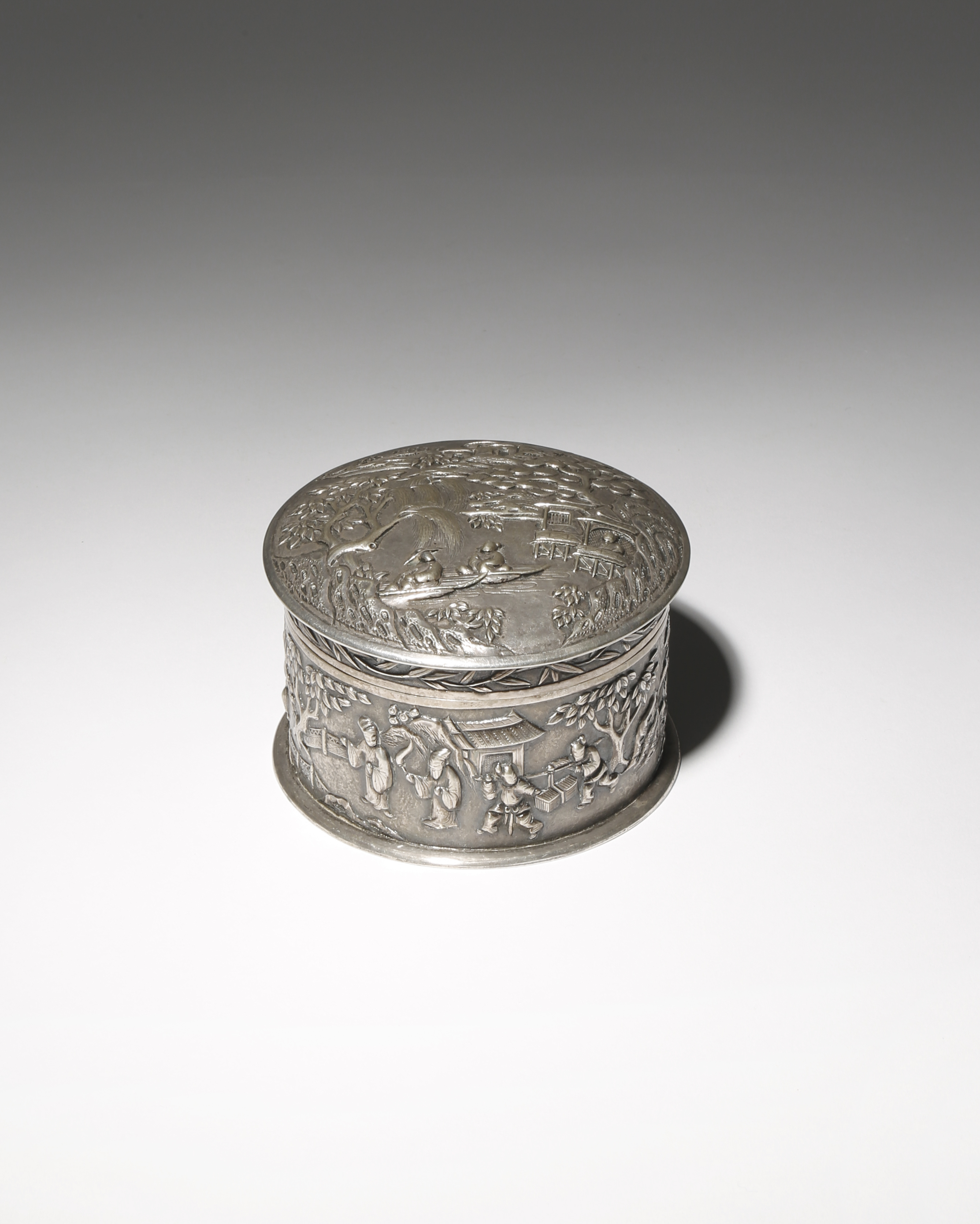 A CHINESE SILVER CIRCULAR BOX AND COVER 2ND HALF 19TH CENTURY The cover and box decorated with...