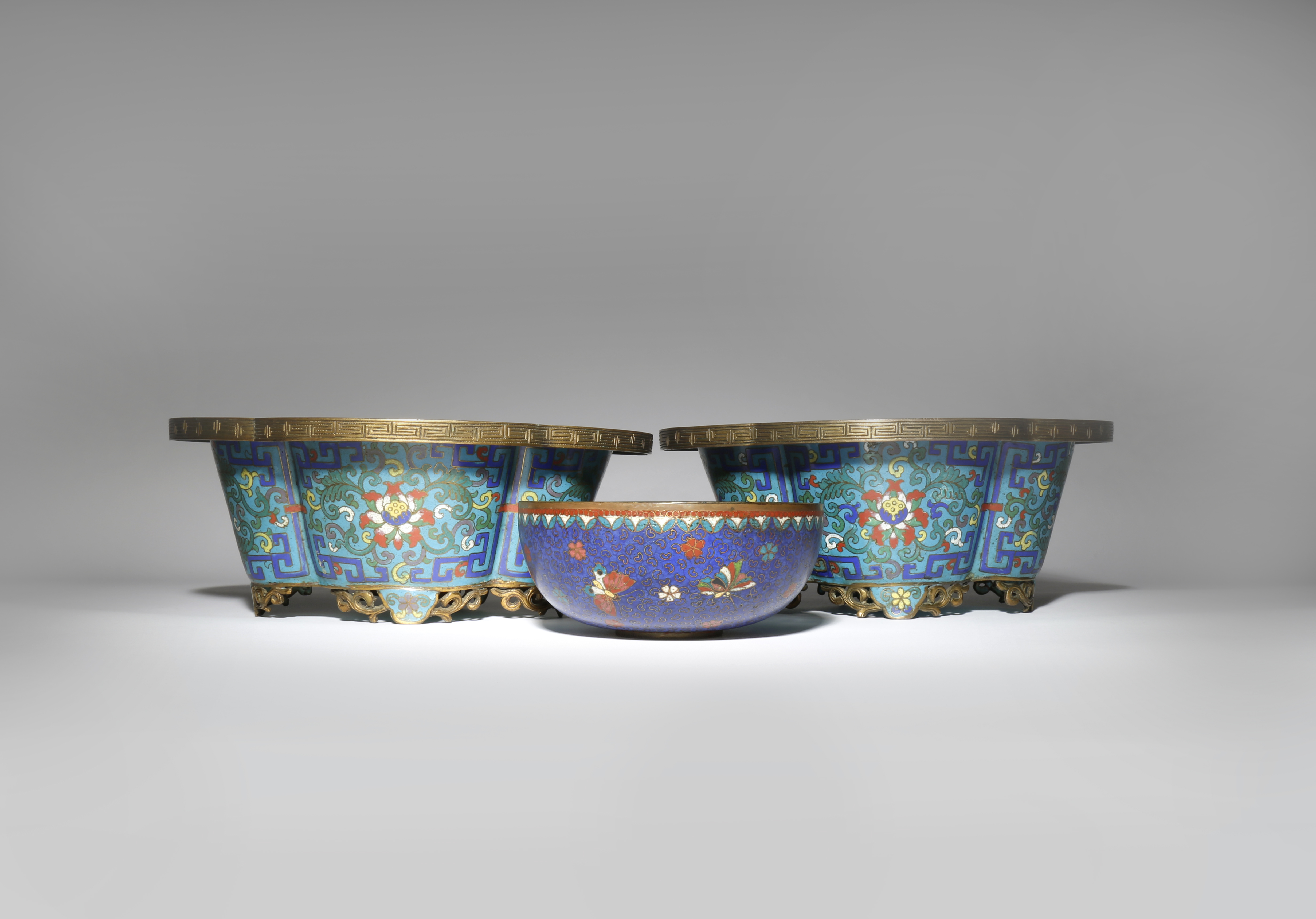 A CHINESE CLOISONNE 'BUTTERFLY' BOWL AND A PAIR OF CLOISONNE JARDINIERES 19TH CENTURY The bowl...