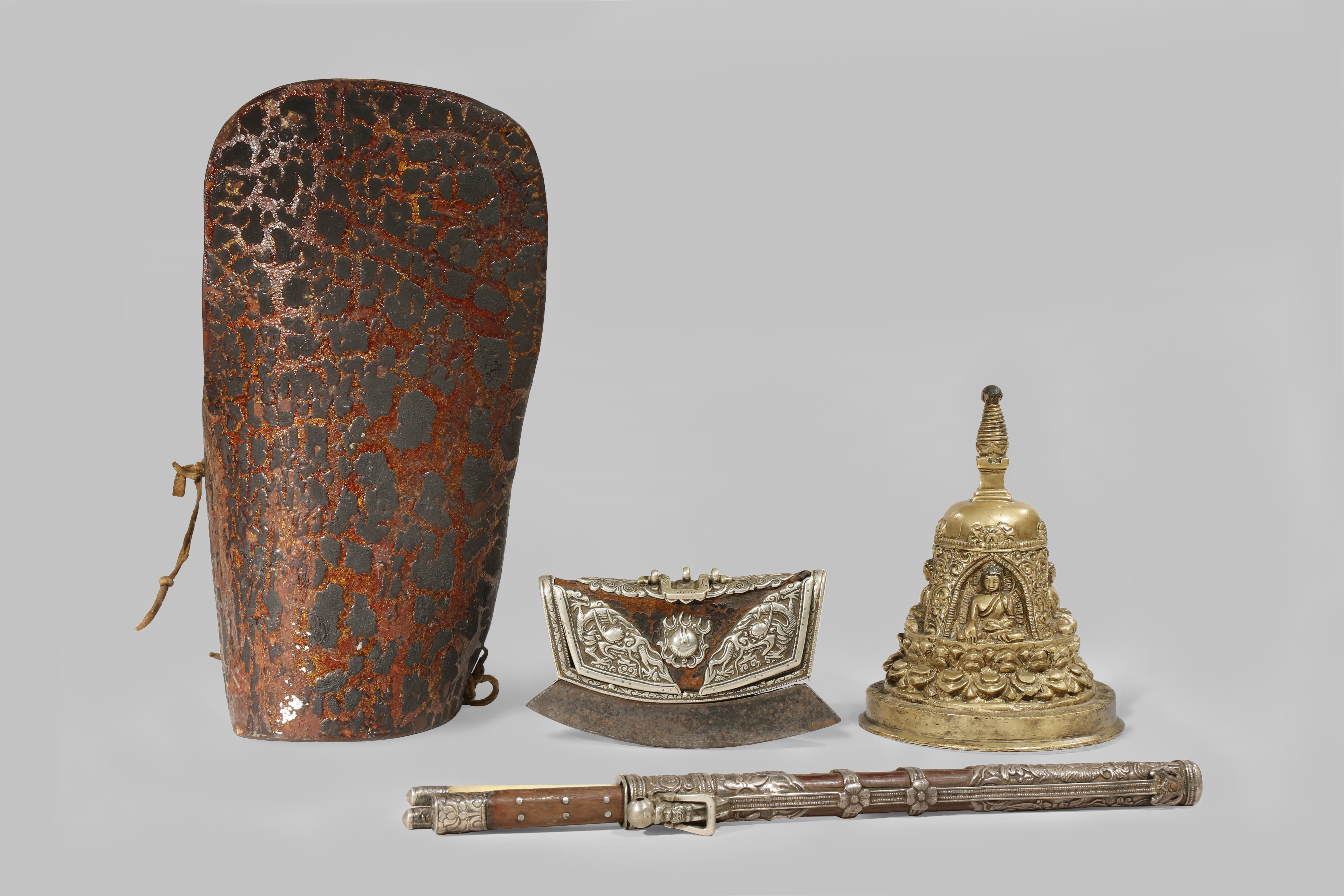 Comprising: a brass stupa, a small purse, a leather forearm guard and a set of cutlery in a scabbard, 30cm, 1.7kg. (7)