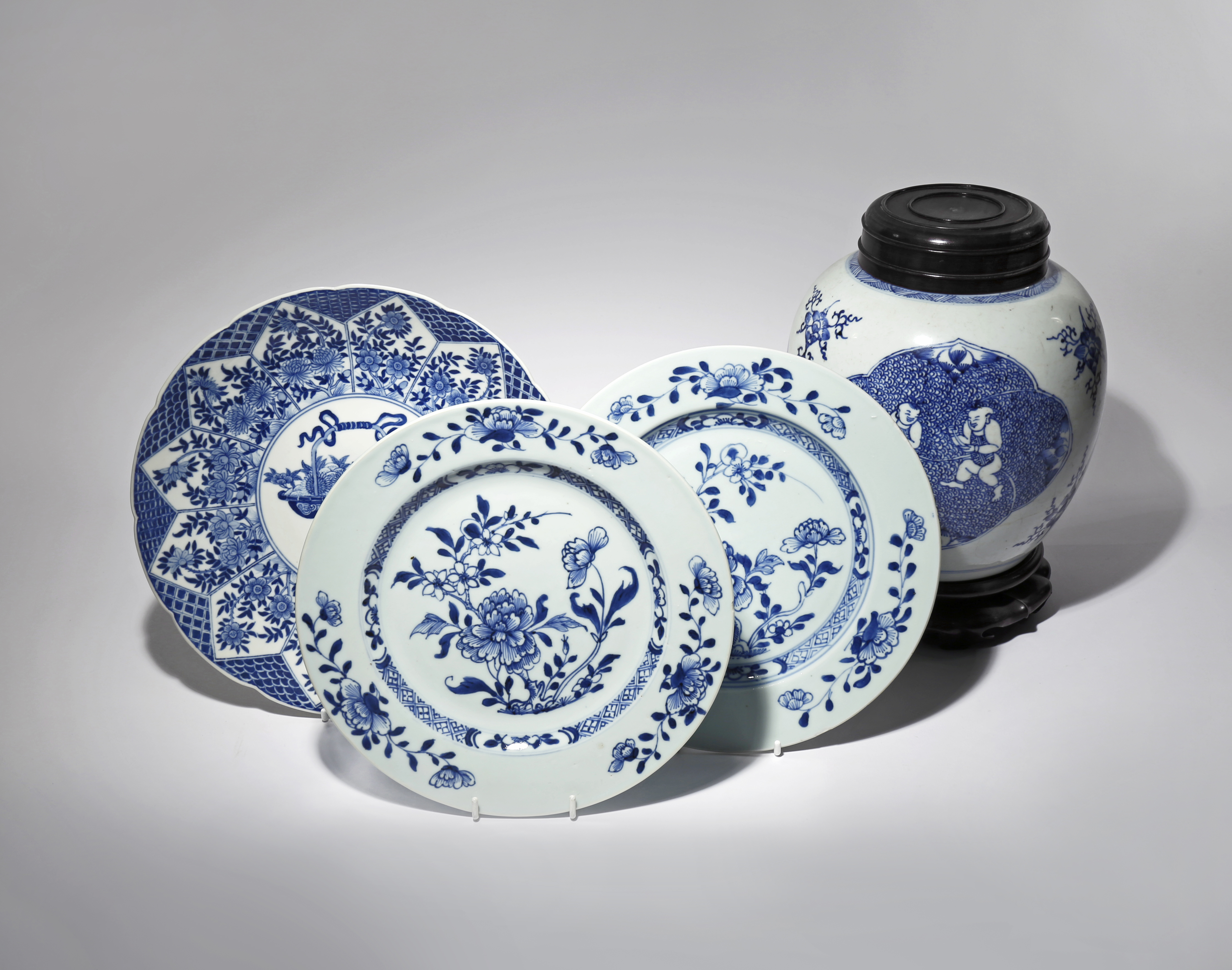 A CHINESE BLUE AND WHITE OVOID VASE AND THREE PLATES 18TH AND 19TH CENTURY The vase painted with...