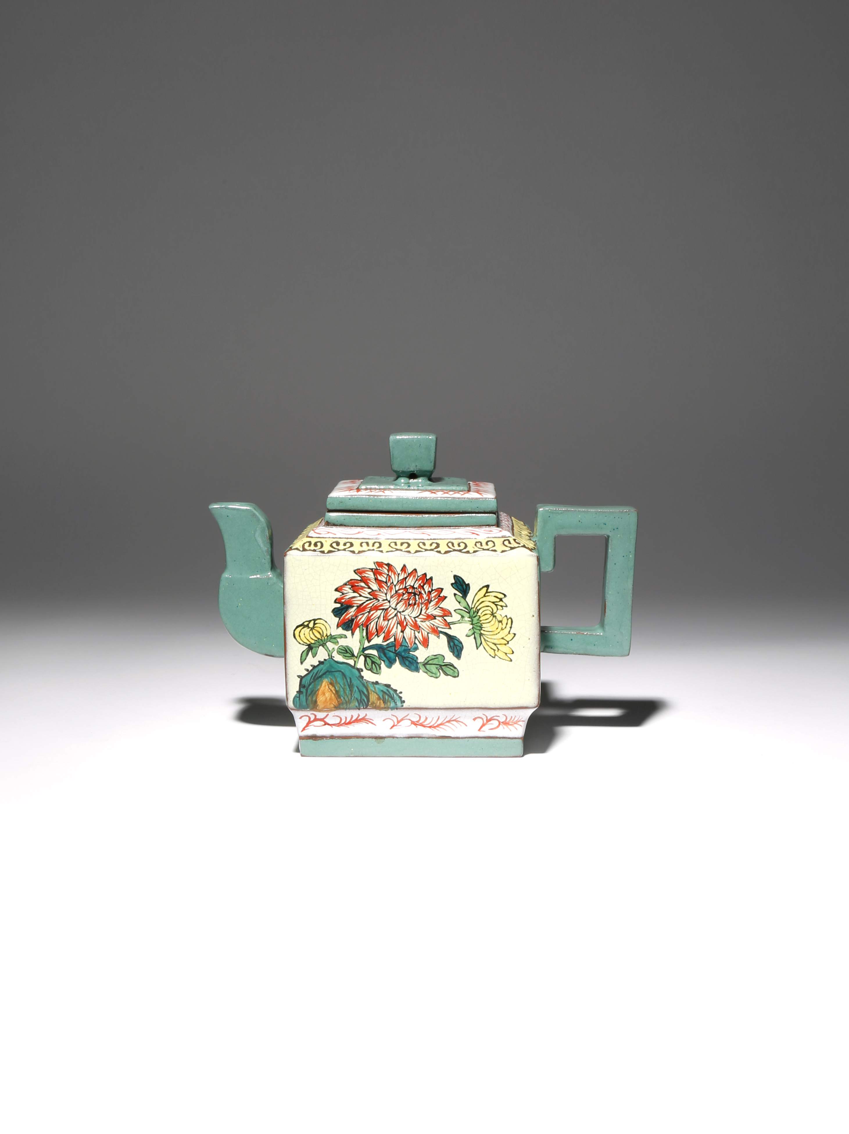 A CHINESE YIXING ENAMELLED SQUARE-SECTION TEAPOT AND COVER