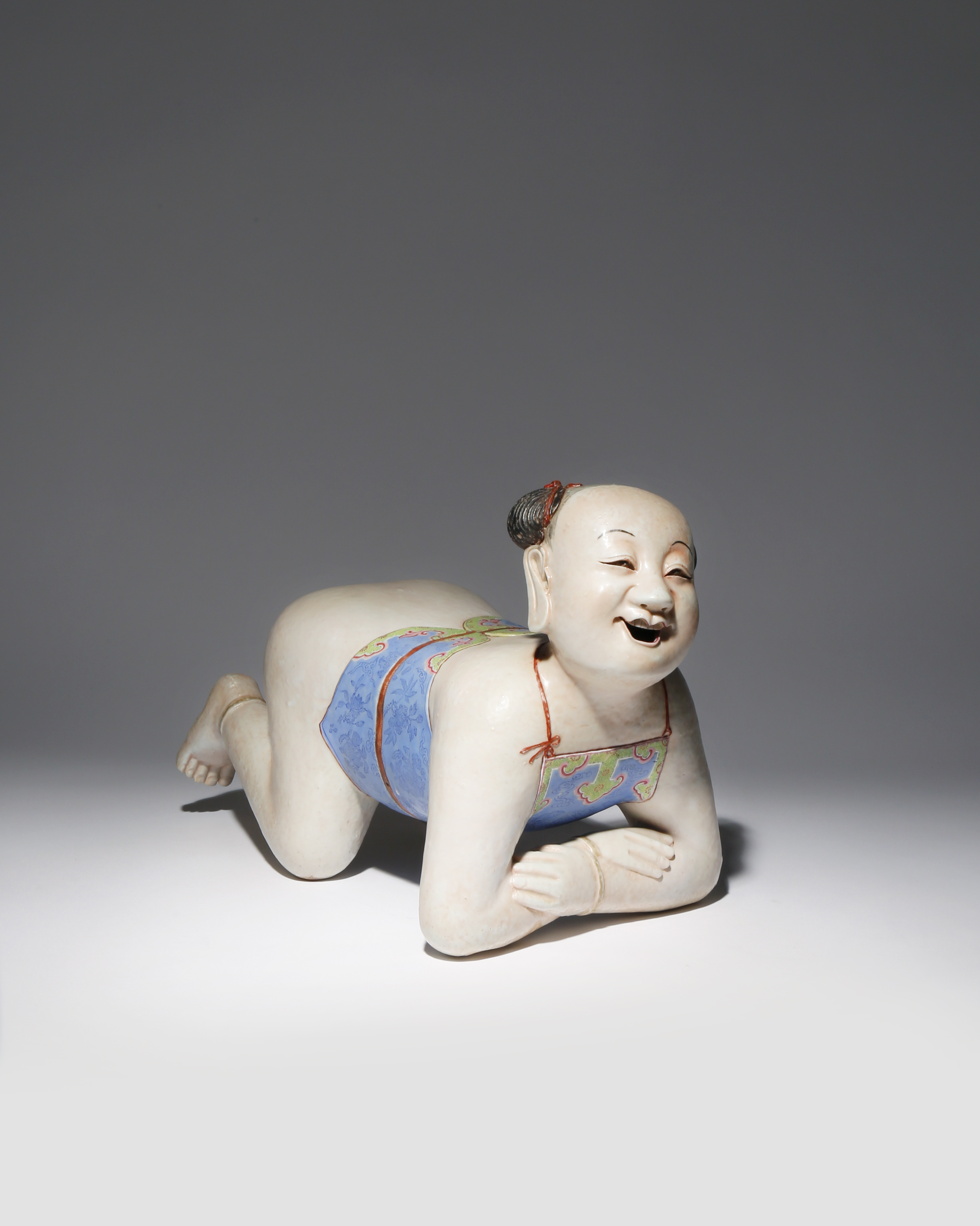 The child depicted resting on his elbows and knees, he lifts his head showing his laughing face, with his hair tied in two buns, he wears a lavender, green and pink tunic decorated with a dragon, butterfly and sprays of various fruits and flowers, 39.5cm.