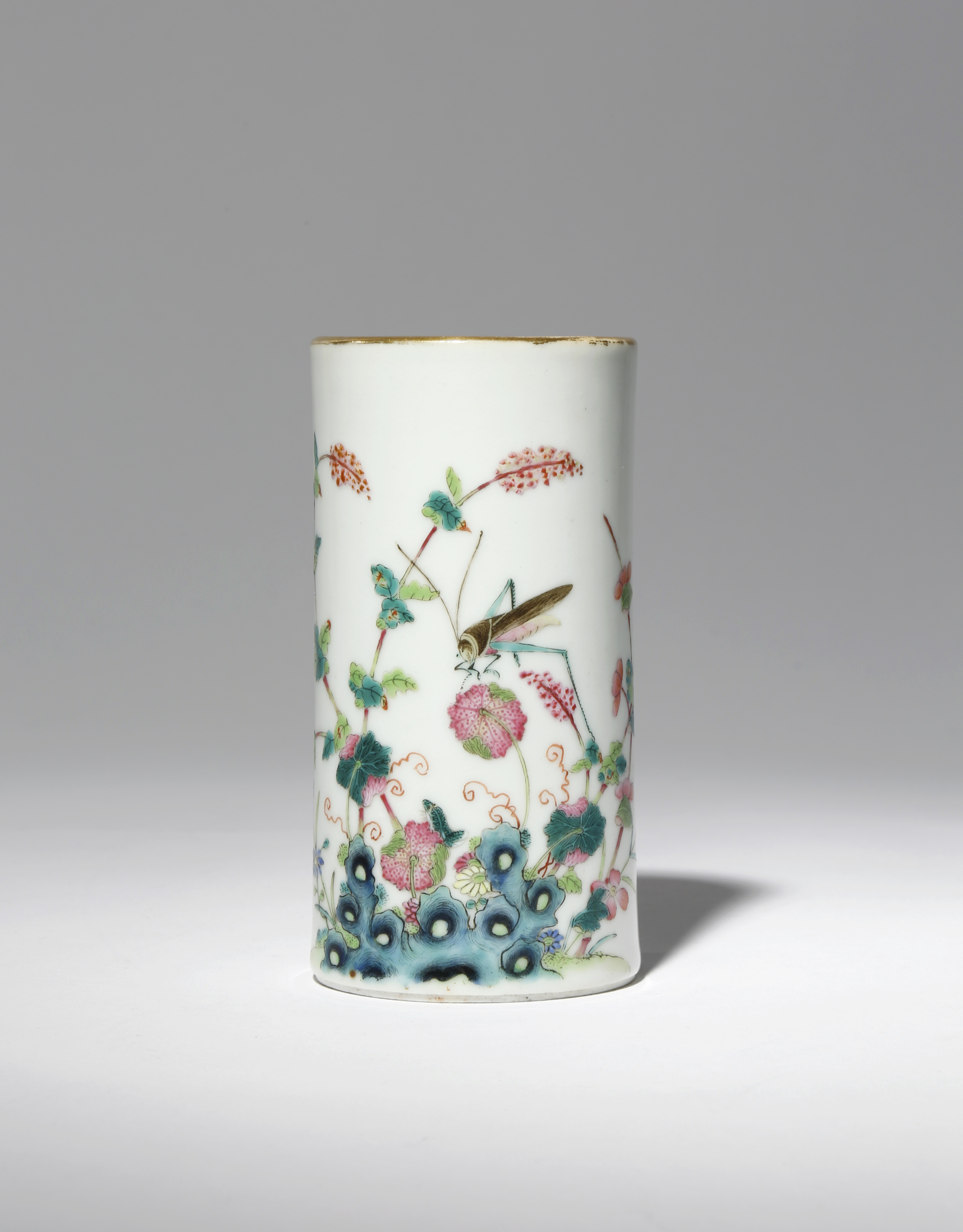A CHINESE FAMILLE ROSE CYLINDRICAL BRUSHPOT