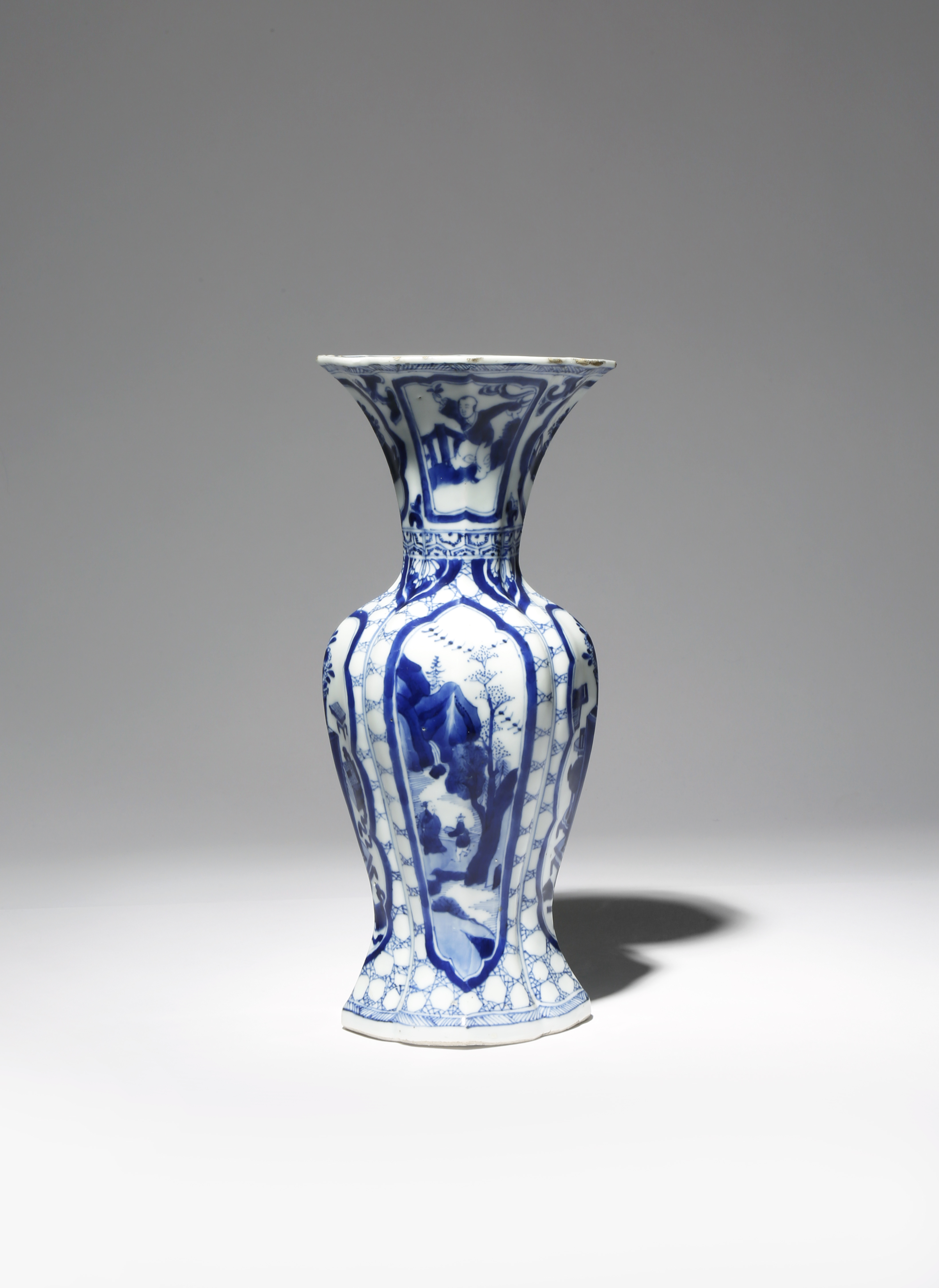 A CHINESE BLUE AND WHITE MOULDED VASE KANGXI 1662-1722 Painted with panels enclosing figures in...