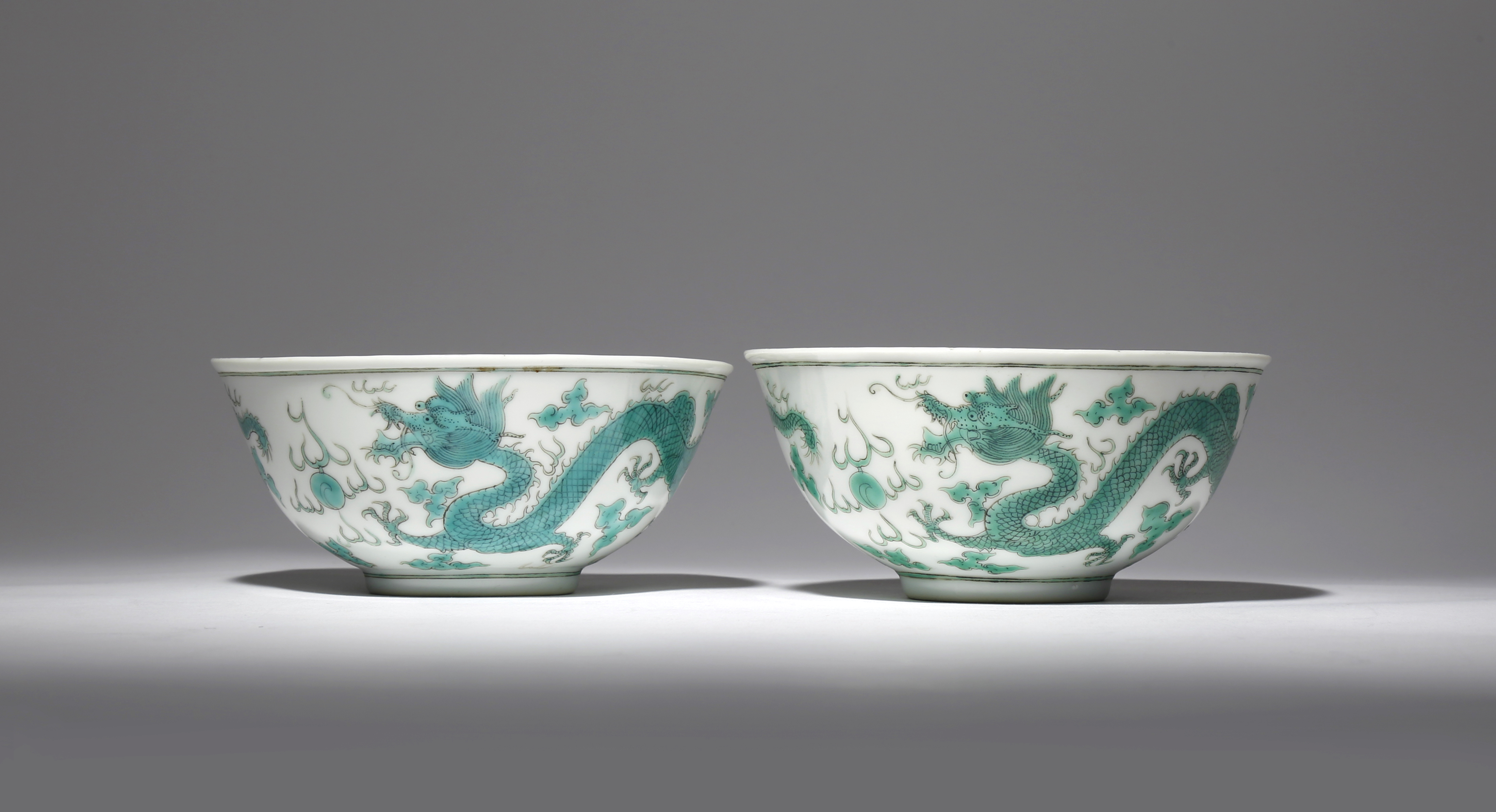 A NEAR PAIR OF CHINESE GREEN-ENAMELLED 'DRAGON' BOWLS