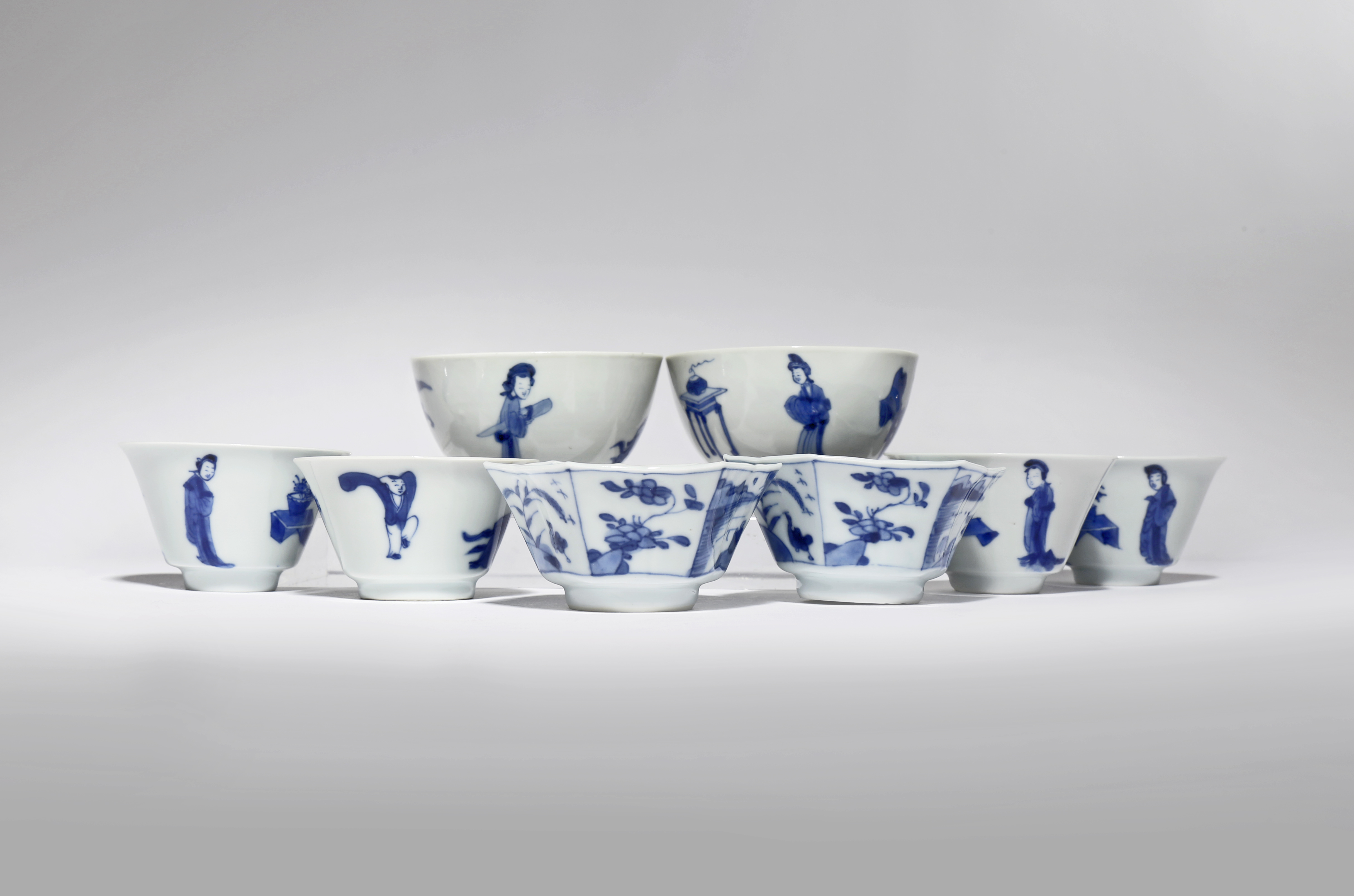 SIX SMALL CHINESE BLUE AND WHITE WINE CUPS AND A PAIR OF TEA BOWLS KANGXI 1662-1722 Comprising: a...