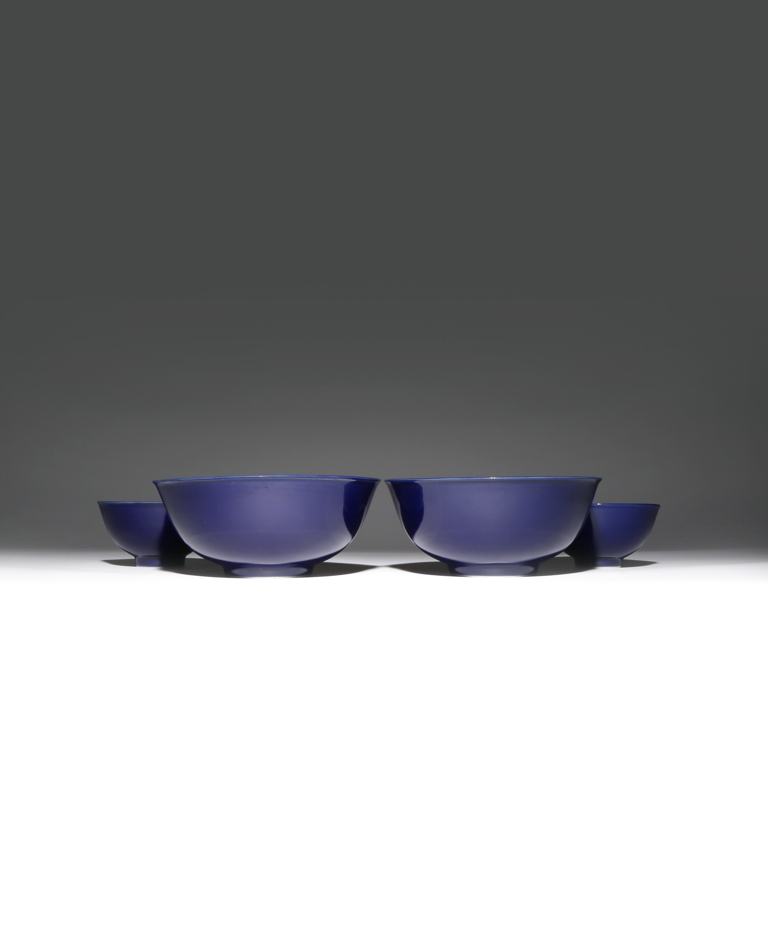 Each with a U-shaped body and an everted rim, decorated all over with a vivid indigo glaze, the bases glazed white and with the reign marks in underglaze blue, 17.5cm max. (4)
