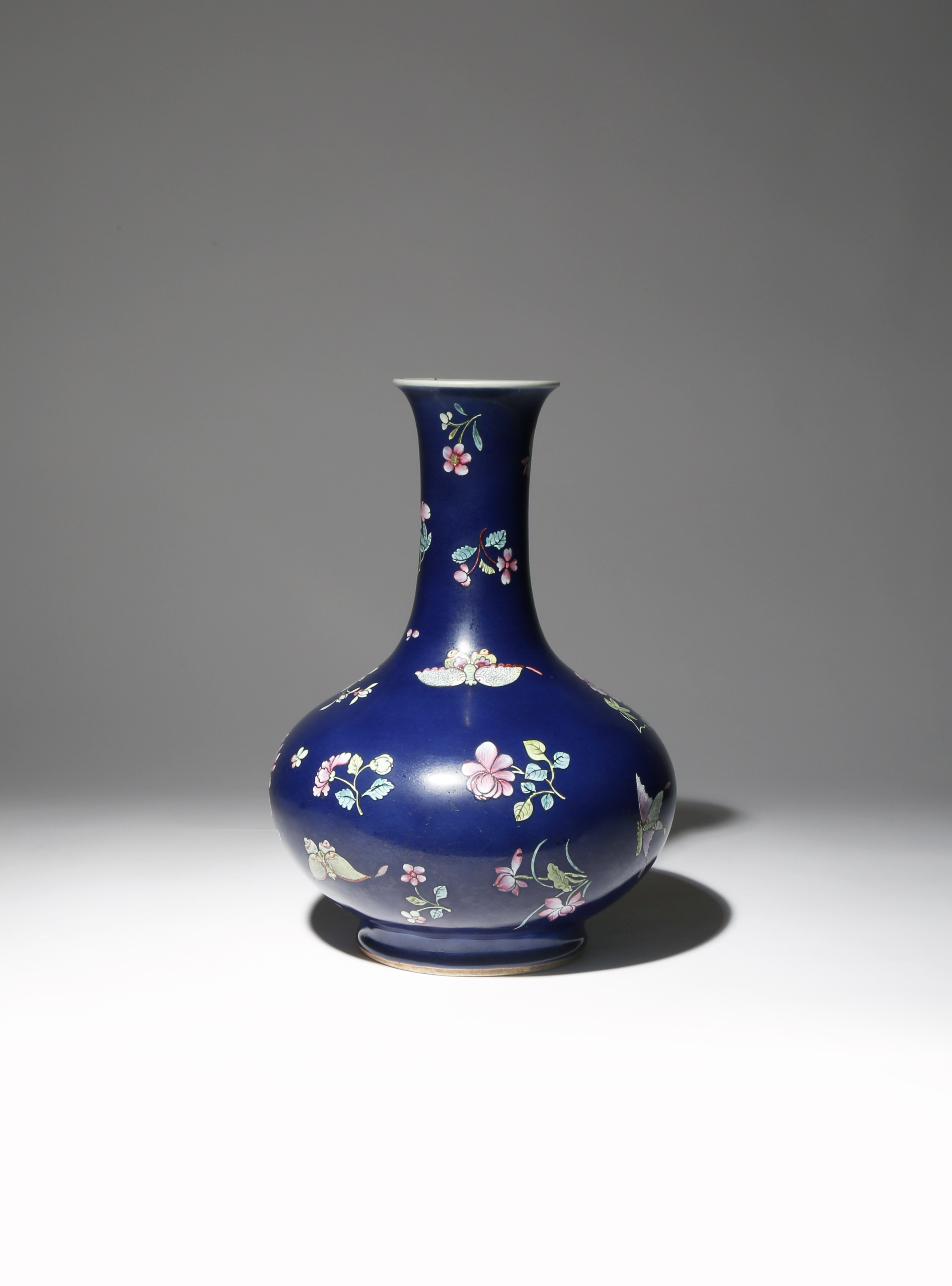 Painted in enamels with butterflies in flight amidst sprays of peony, hibiscus, chrysanthemum and other flowers, all set against a dark blue ground, the interior and base glazed white, 34.2cm.