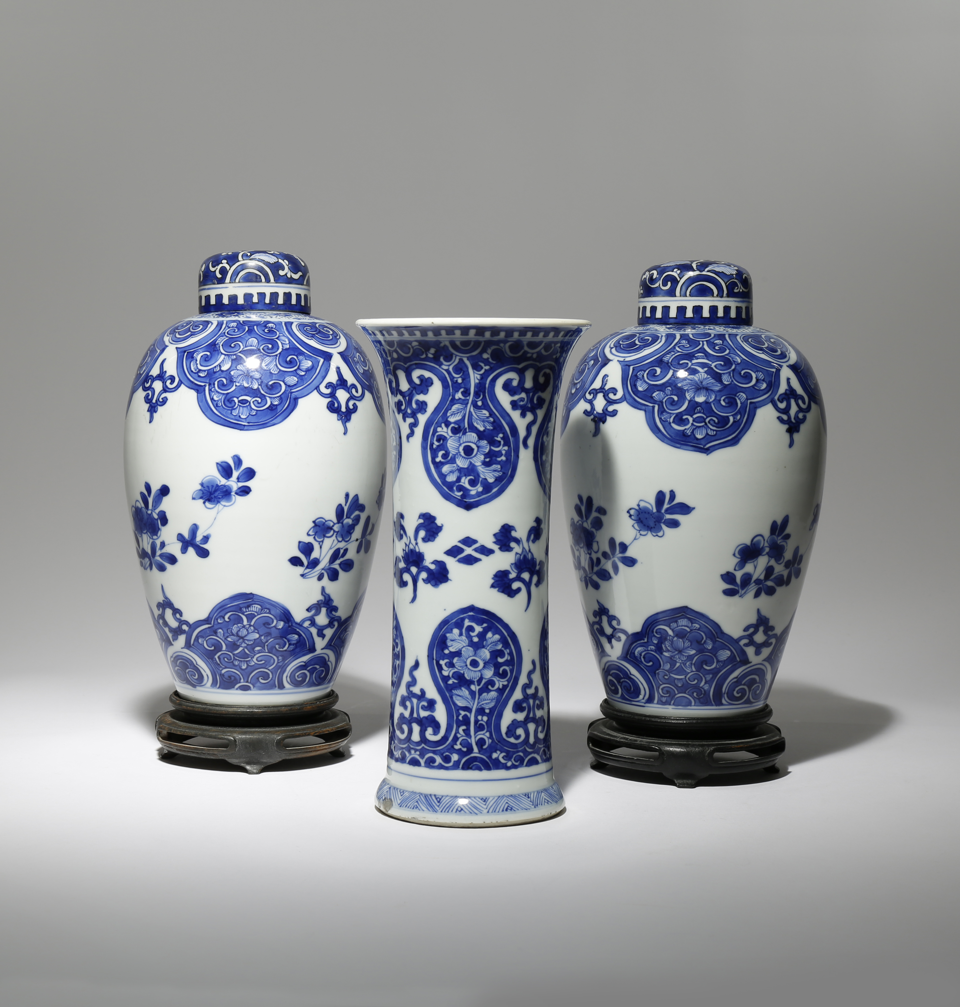 A PAIR OF CHINESE BLUE AND WHITE OVOID VASES AND A BEAKER VASE KANGXI 1662-1722 Decorated with...