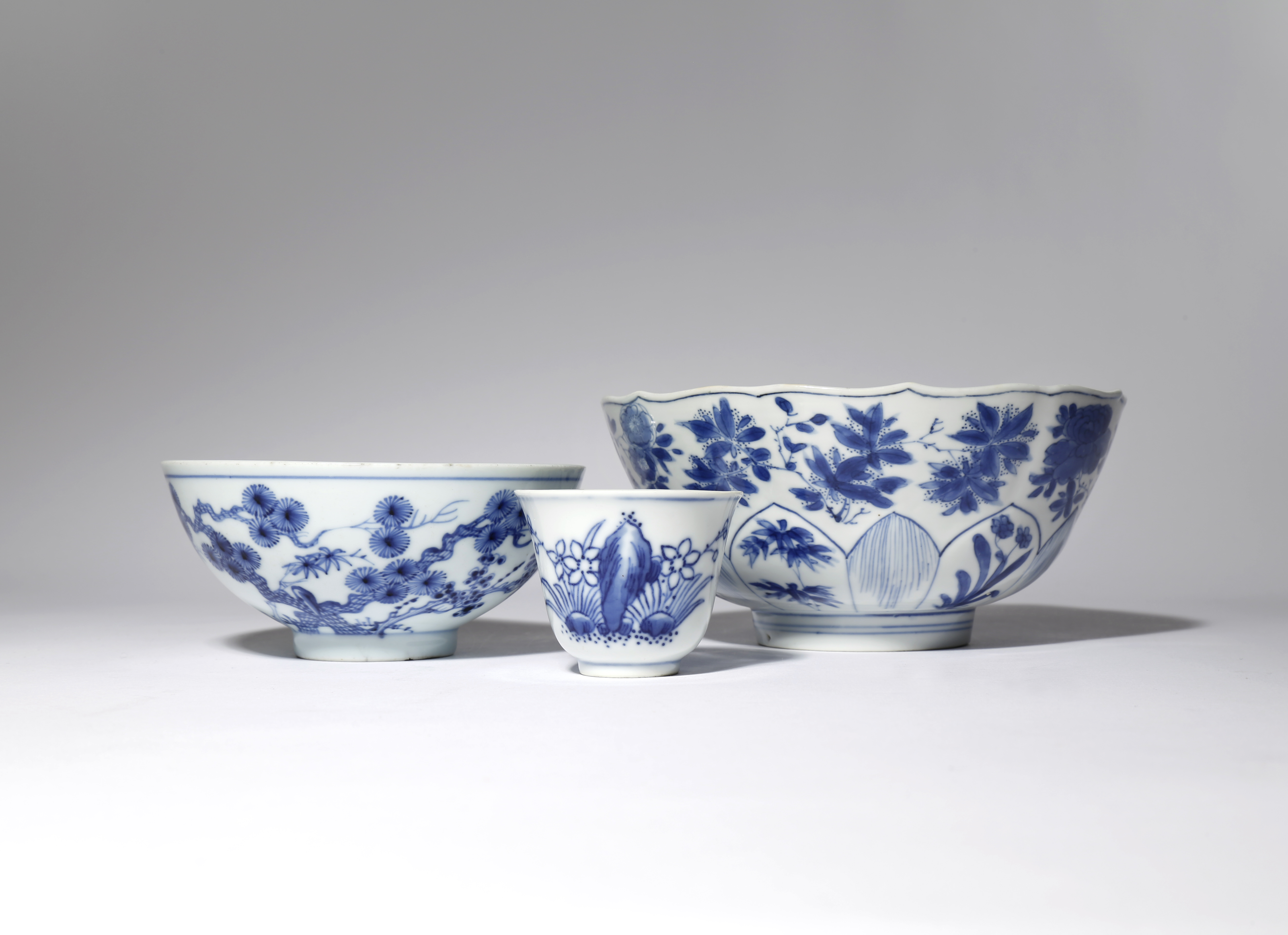 Comprising: a moulded bowl decorated with various floral sprays, six character Kangxi mark and of the period, a blue and white bowl painted with the Three Friends of Winter, six character Yongzheng mark and of the period, and a wine cup with flowers growing amidst rocks to the exterior, six character Tongzhi mark and of the period, 15.6cm max. (3)