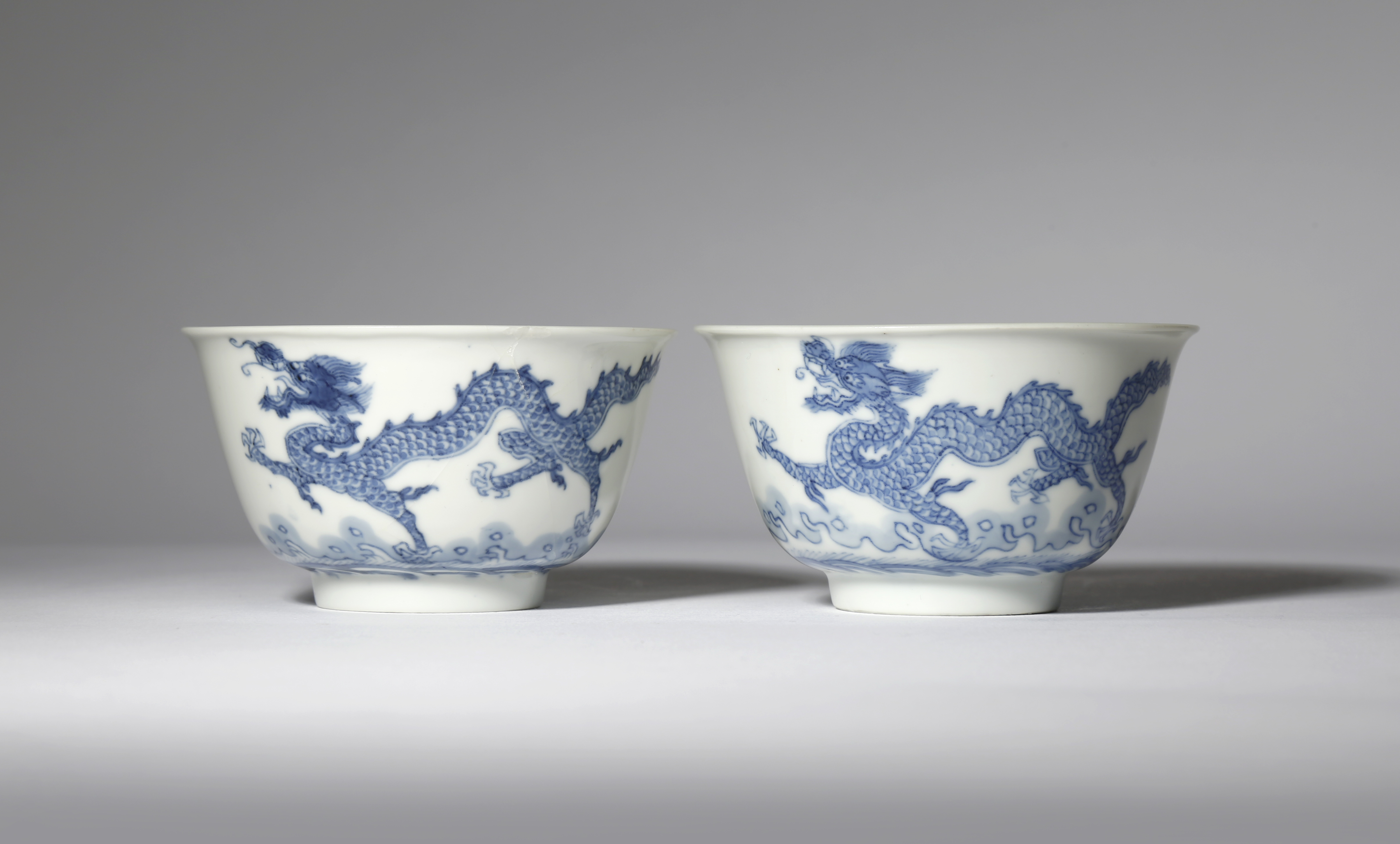 A PAIR OF CHINESE BLUE AND WHITE 'DRAGON' BOWLS KANGXI 1662-1722 Each painted with two scaly...