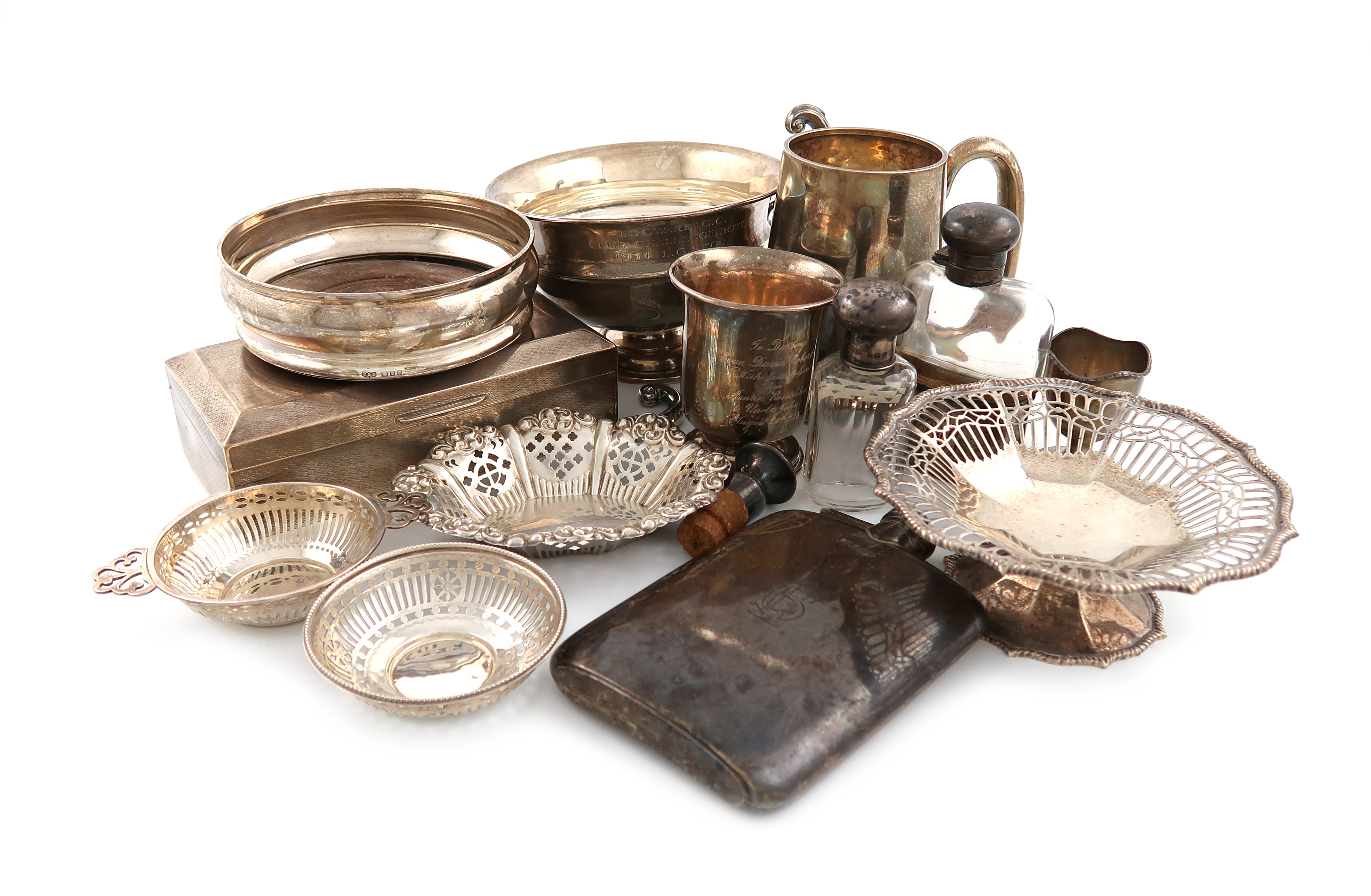 comprising: a hip flask, by Mappin and Webb, Sheffield 1918, a silver-mounted glass spirit flask, with a pull-off drinking cup, London 1895, a mug, Birmingham 1937, a modern wine coaster, a two handled bowl, (one handle a.f), a cigarette box, another mug, a pierced tazza, three pierced bonbon dishes, an egg cup, a toilet bottle, and an electroplated bottle stopper, approx. weighable 39oz. (qty)