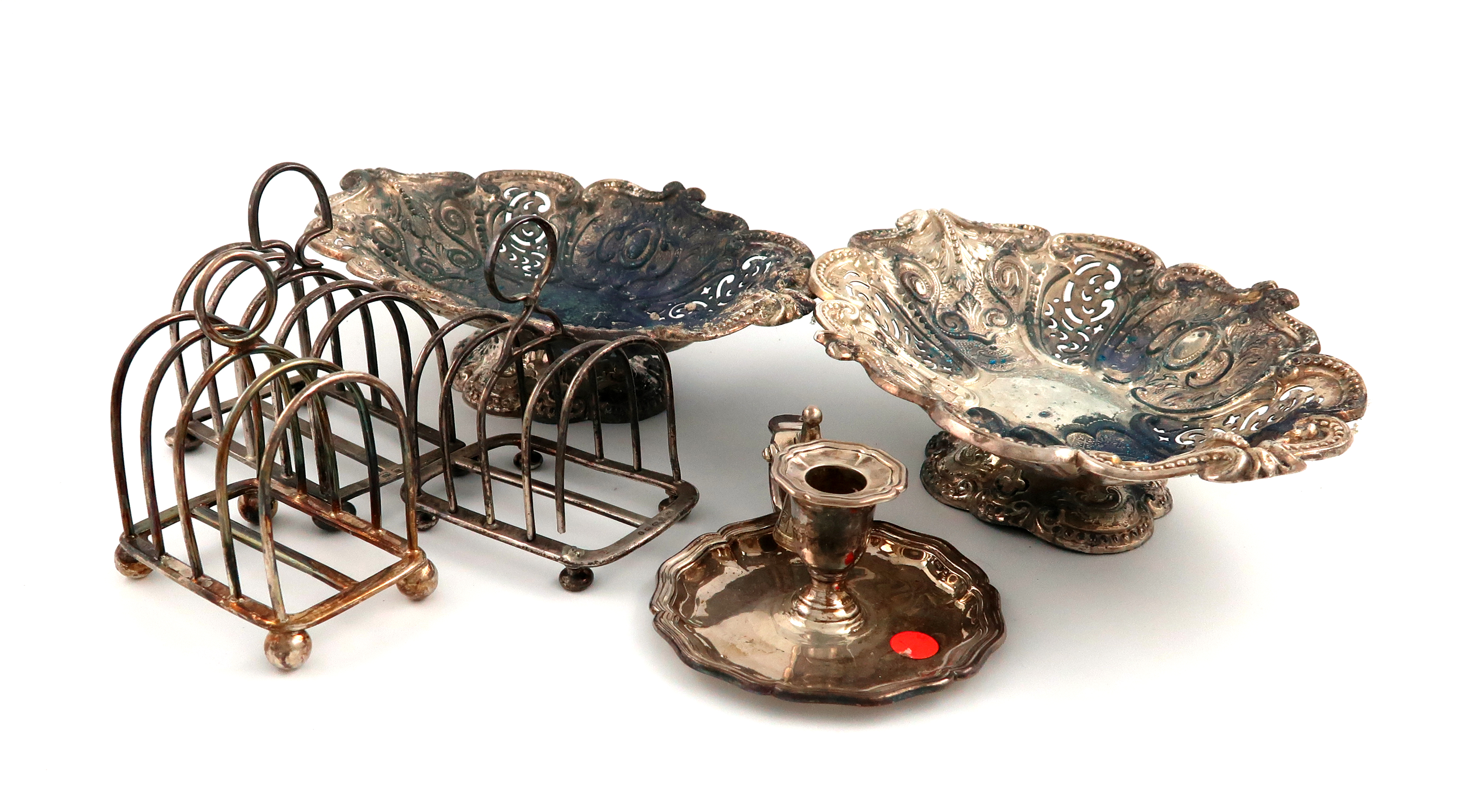 comprising: a Victorian small chamber stick, by Creswick and Co, Sheffield 1844, circular form, moulded border, a pair of pierced oval dishes, by H. Atkins, Sheffield 1892, plus three toast racks, approx. weight 34oz. (6)