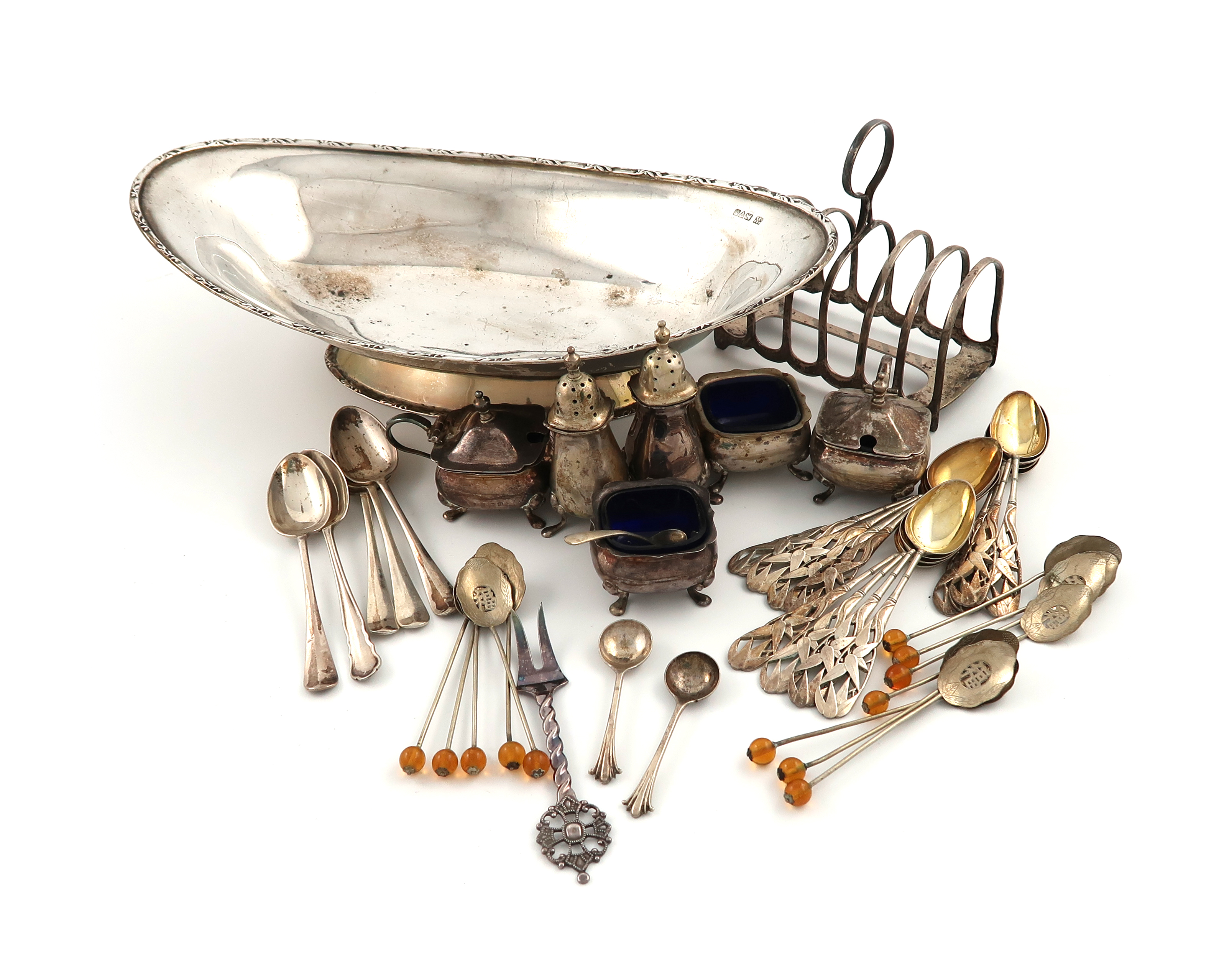 comprising: an oval dish, foliate border, Chester 1919, a toast rack, a three-piece condiment set and seven spoons, plus Chinese items, a matching three-piece condiment set, a set of twelve teaspoons, the handles pierced with bamboo decoration, and twelve coffee spoons, approx. weight 28oz. (qty)