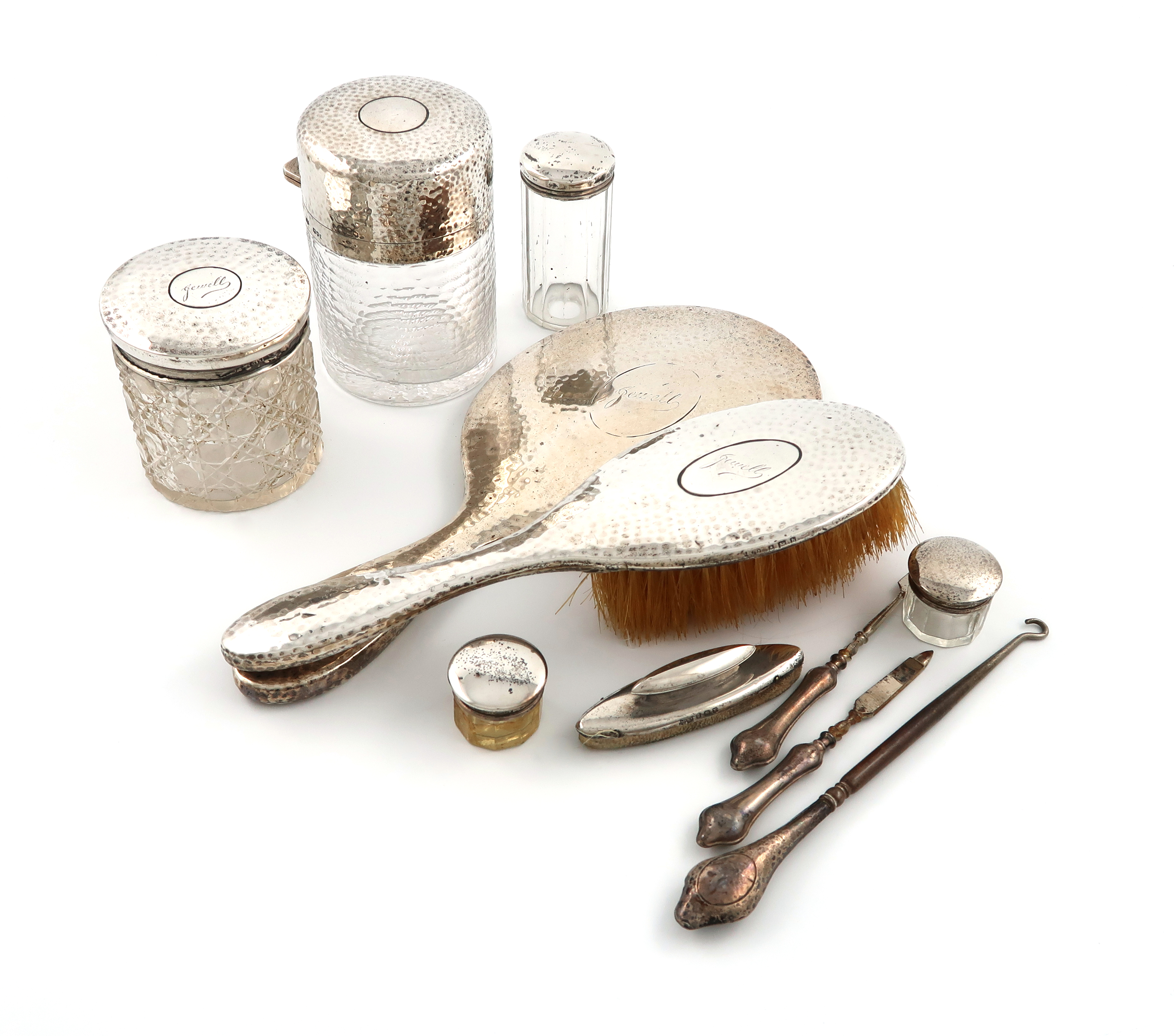 comprising: a large late-Victorian silver-mounted jar, by Mappin and Webb, London 1891, cylindrical form, spot-hammered decoration, and with textured glass, plus a hand mirror, a brush, four toilet jars, three manicure items and a button hook. (qty)
