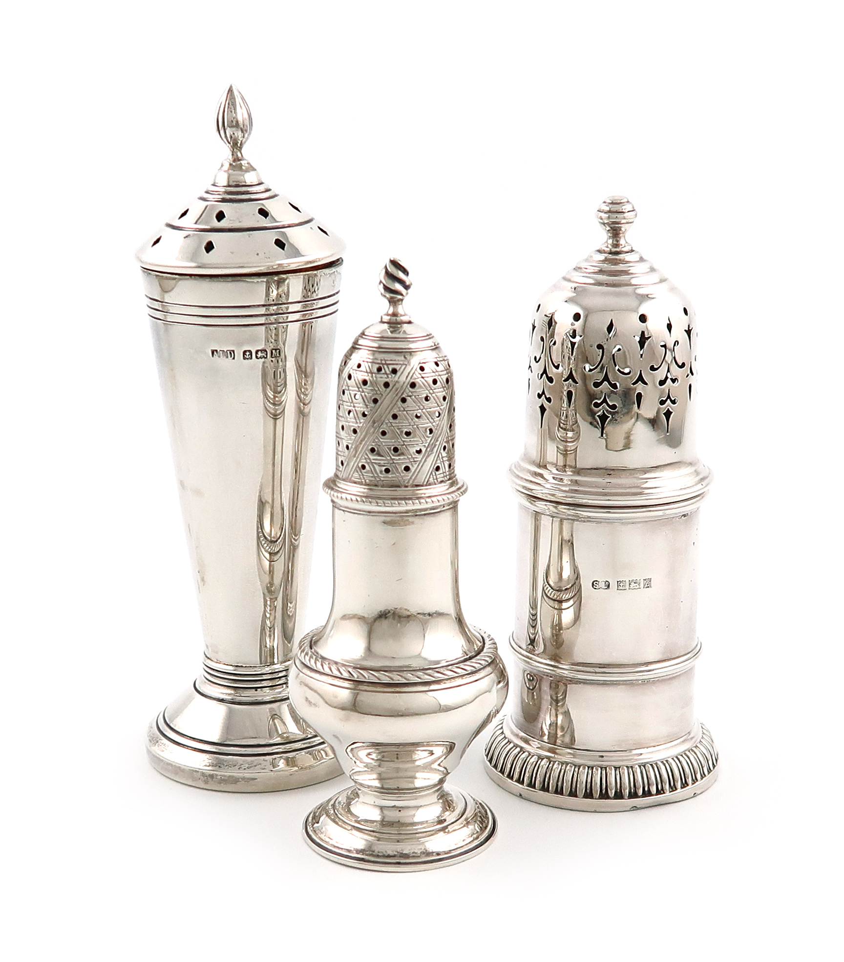 comprising: a George III pepper pot, by Samuel Woods, London 1763, baluster form, rope-work border, with an associated pierced pull off cover, by T. Daniell, plus a sugar caster of lighthouse form, by William Suckling Ltd, Birmingham 1960, and an Art Deco sugar caster, by A L Davenport Ltd, Birmingham 1936, tapering circular form, wooden underside of base, approx. weighable 7.7oz. (3)