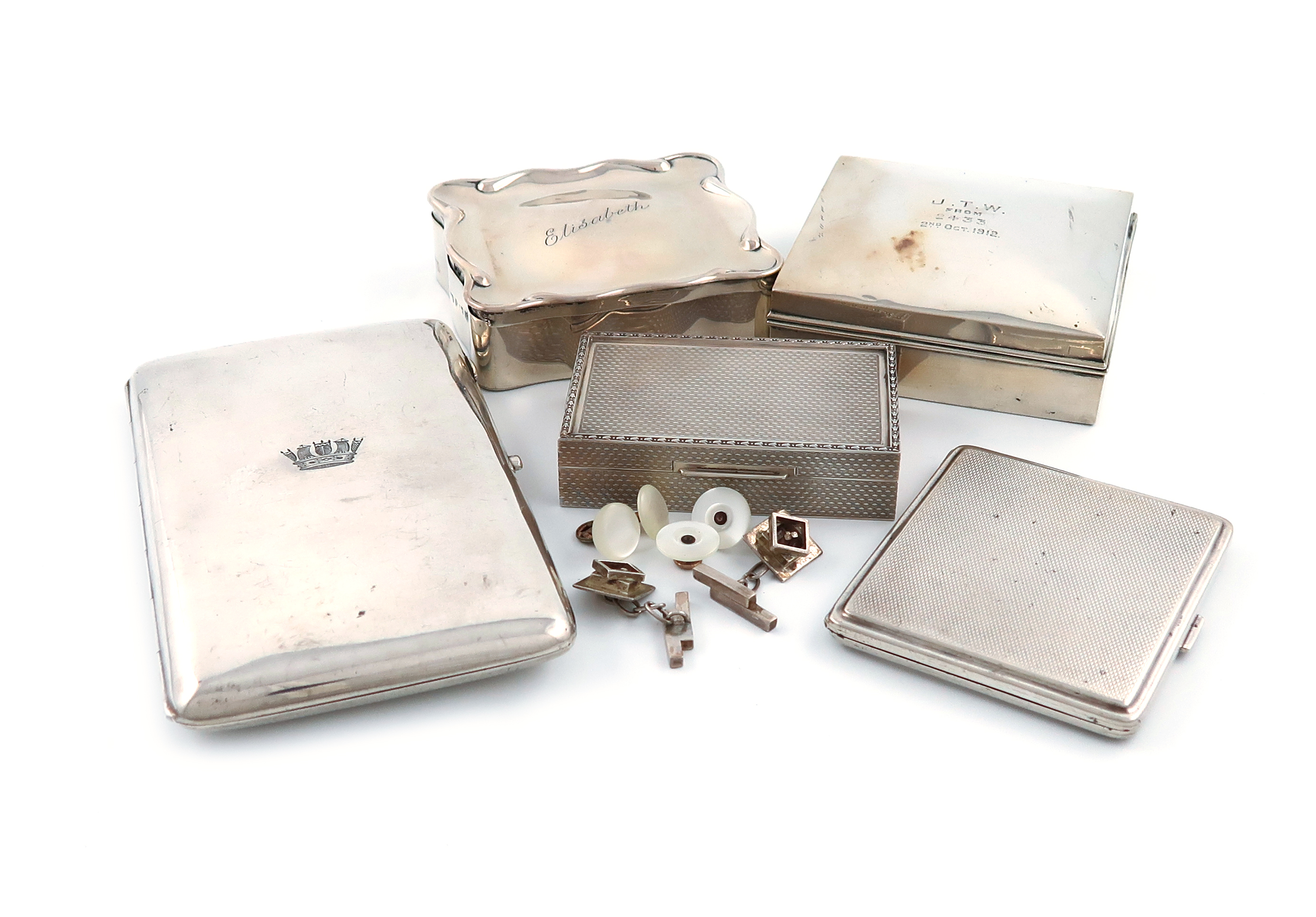 comprising: a naval cigarette case, the front with the Naval crown, the reverse with the names of various ships, the interior inscribed, length 14.8cm, plus a dressing table box, of rectangular form, engine-turned decoration, London 1955, the interior with four dress studs and a pair of cufflinks, plus another dressing table box, a cigarette box and a cigarette case, approx. weighable 14oz. (5)