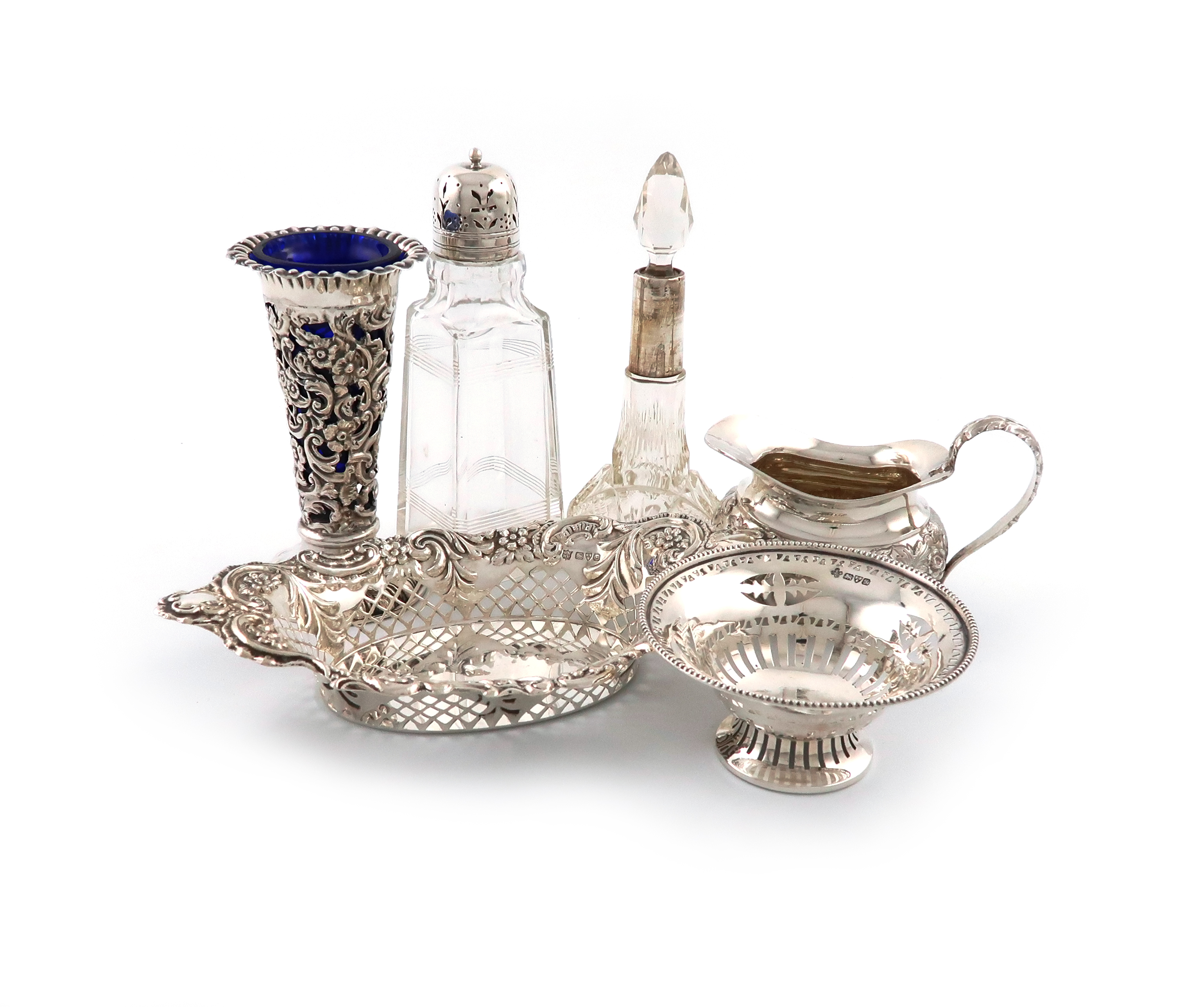 comprising: a late-Victorian cream jug, by Nathan and Hayes, Chester 1898, a pierced bonbon dish of oval form, a circular bonbon dish, a pierced trumpet vase, Chester 1900, with a blue glass liner, a silver-mounted scent bottle and a silver-mounted glass sugar caster, approx. weighable 7.5oz. (6)