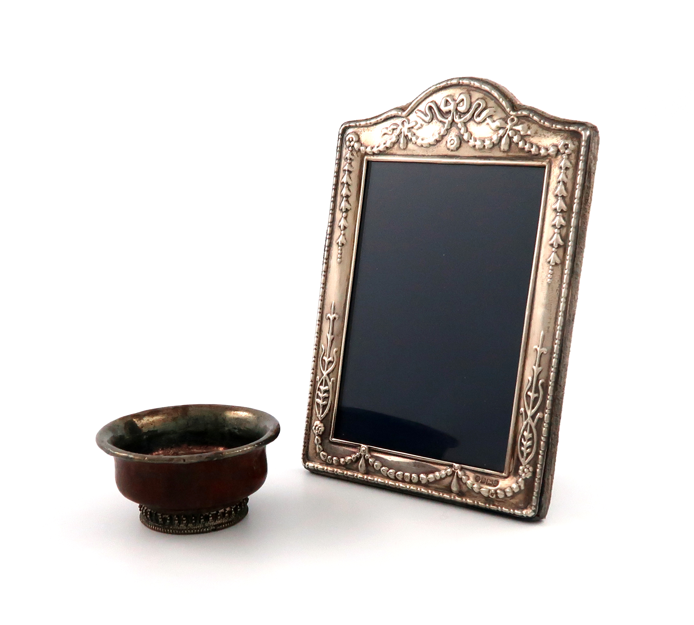 circular form, the base with foliate and bead decoration, diameter 7cm, plus a modern silver-mounted photograph frame, Sheffield 1992. (2)