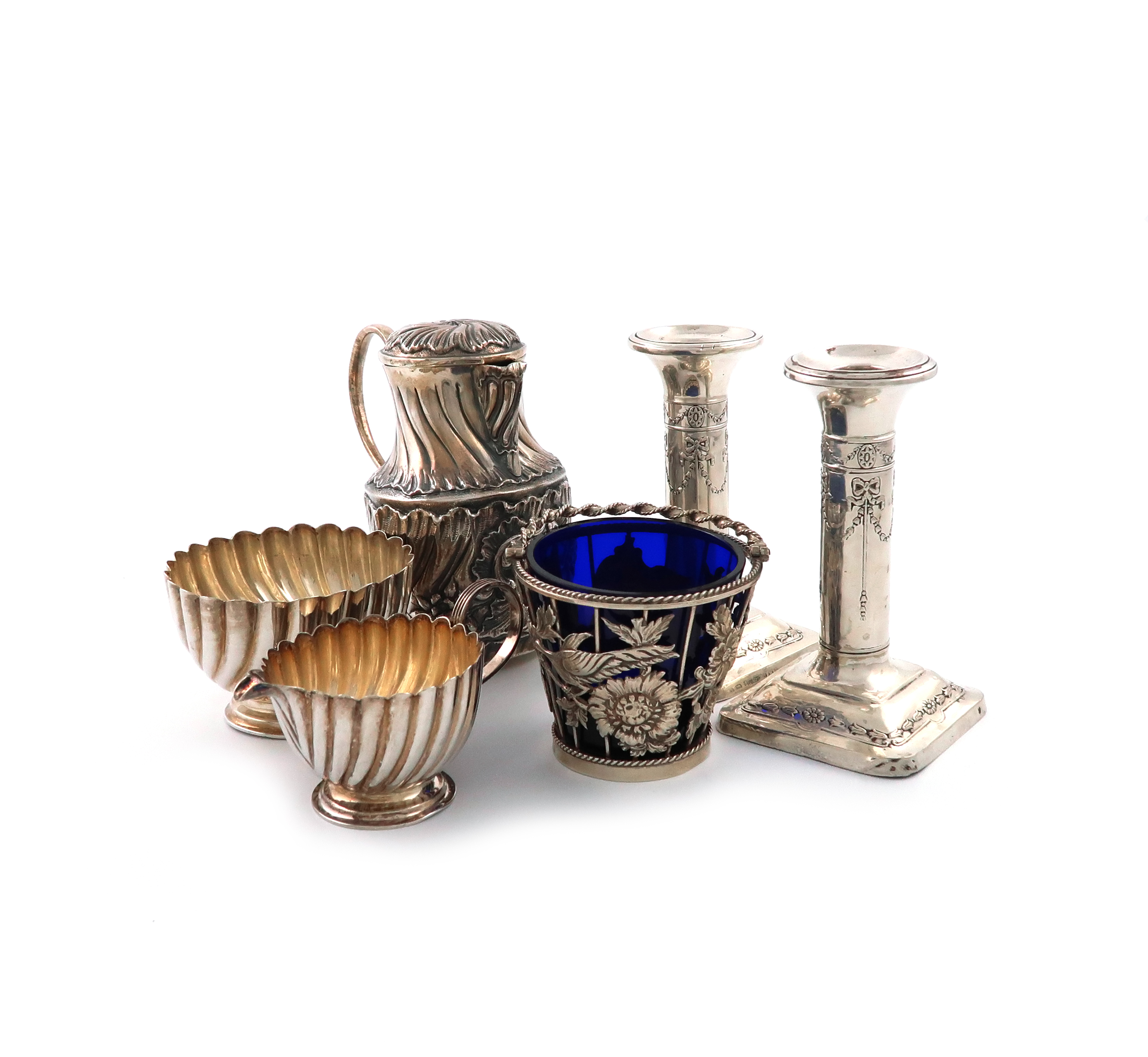 comprising: a swing-handled basket, London 1916, tapering wire-work body with birds and flowers and with a blue glass liner, plus a cream jug and sugar bowl, London 1893, a pair of candlesticks, and a metalware jug, of fluted baluster form with a hinged cover, approx. weighable 8.3oz. (6)