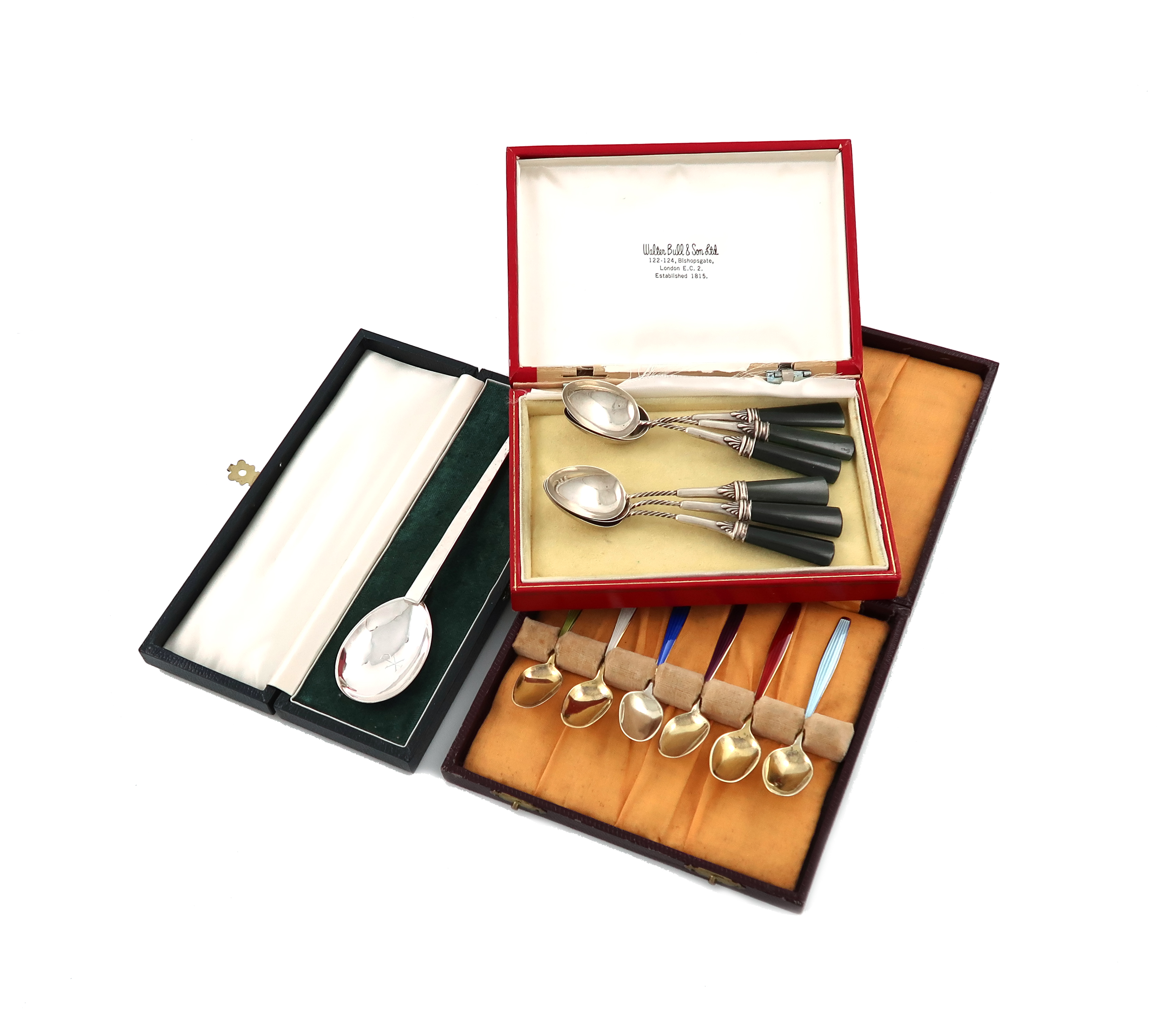 the handles with vari-coloured enamel decoration, in a fitted case, plus a set of six silver and nephrite teaspoons, by J and R Griffin, Chester 1924, cased, plus a modern copy of a Roman spoon by Anvic Silver Ltd, approx. weight 4oz. (3)
