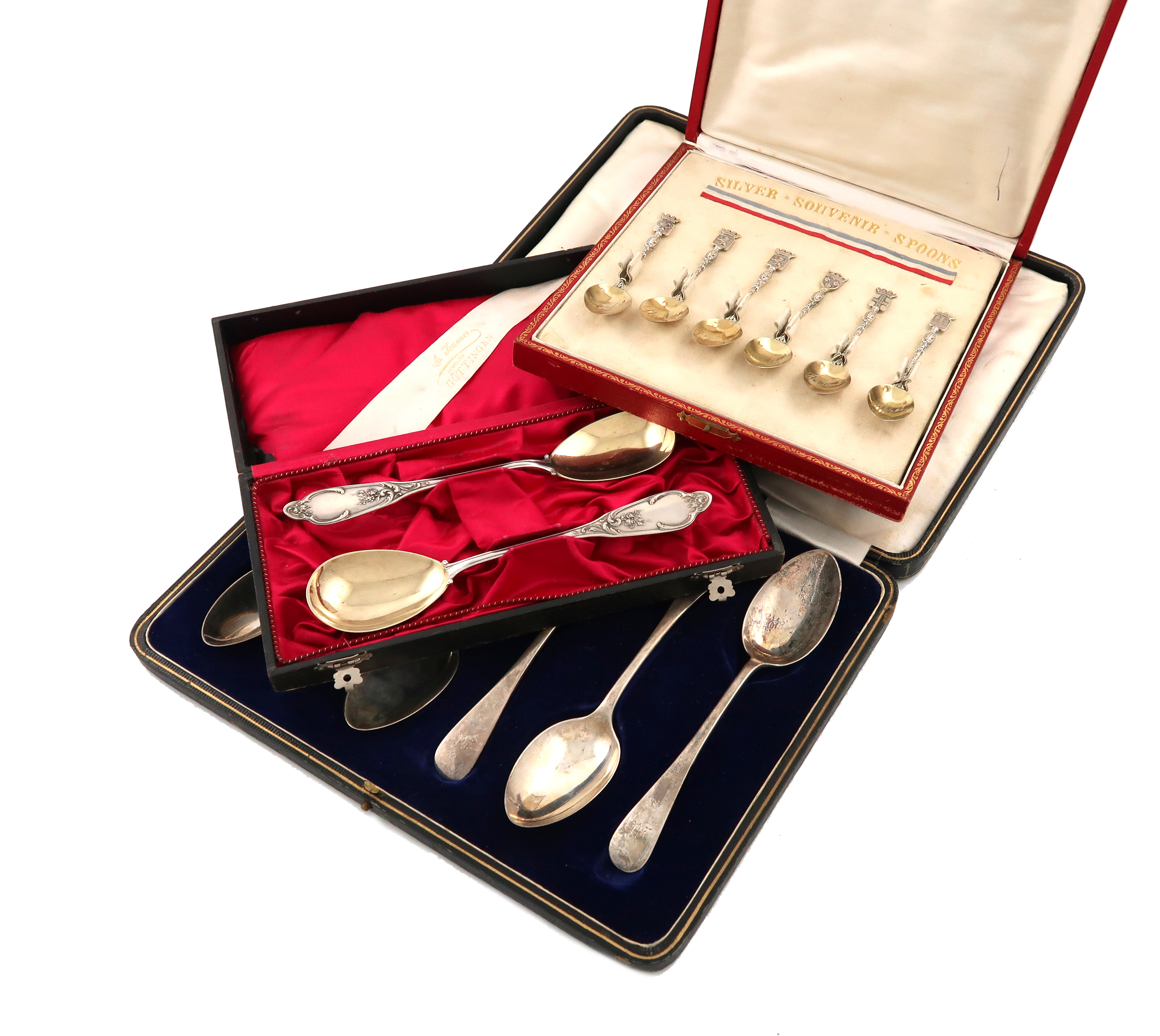 the terminals initialled, in a fitted case, plus a pair of French silver serving spoons, cased and a set of six French parcel-gilt teaspoons, cased, approx. total weight 12.5oz. (3)
