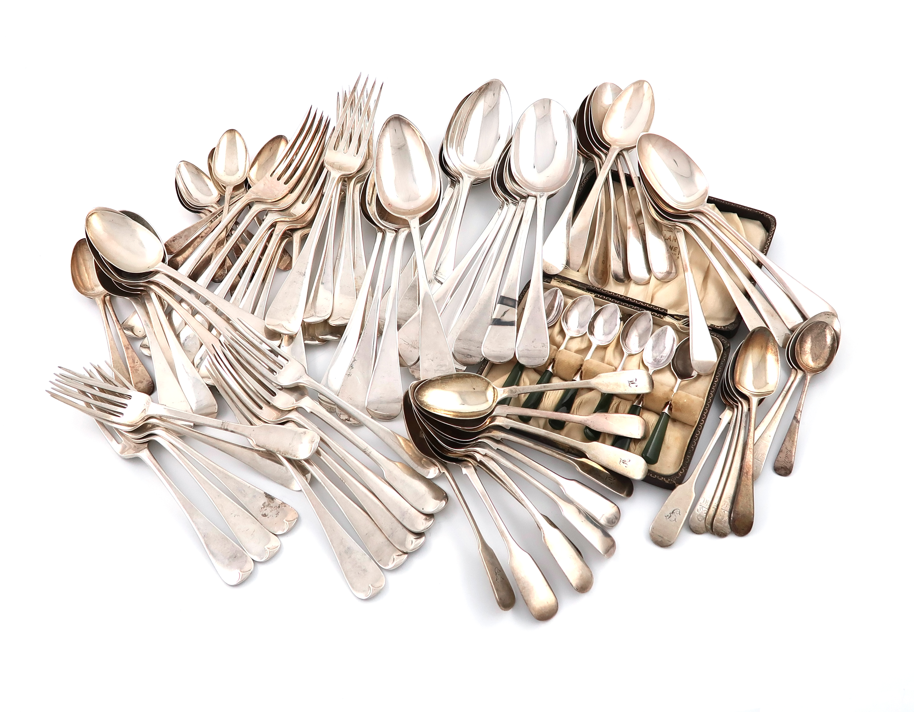 comprising: fourteen table forks, fourteen tablespoons, seventeen dessert spoons, ten dessert forks, and eighteen teaspoons, plus two Fiddle pattern dessert forks, eleven Fiddle pattern teaspoons, a set of cased New Zealand nephrite handed teaspoons, by Joseph Swindell and Sons, approx. weight 117oz. (qty)