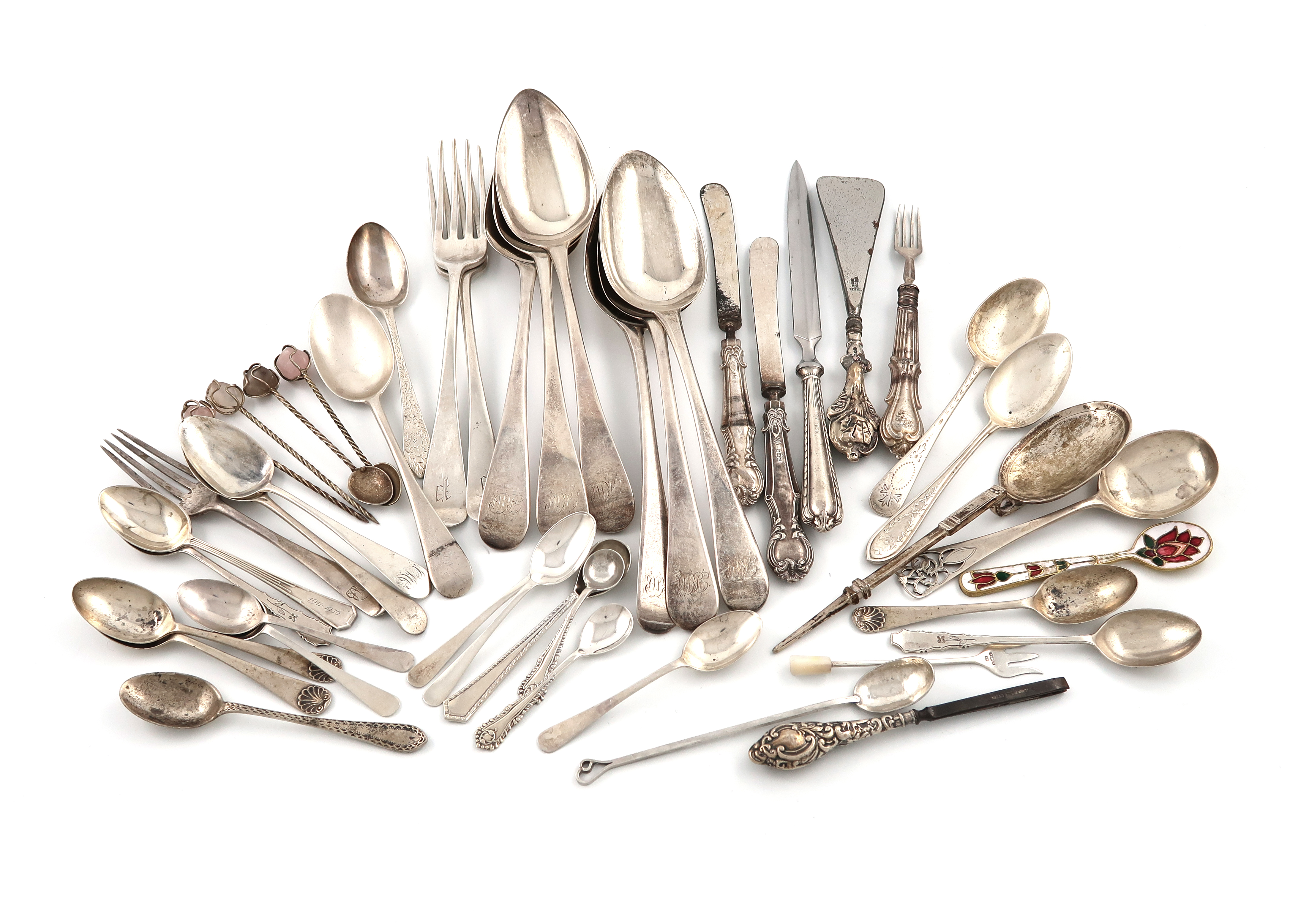 comprising: six Old English pattern tablespoons, an Arts and Crafts spoon by Enid Kelsey, London 1935, a copy of a Roman spoon, two table forks, a jam spoon, seventeen tea and coffee spoons, and other items, approx. weighable 27oz. (qty)