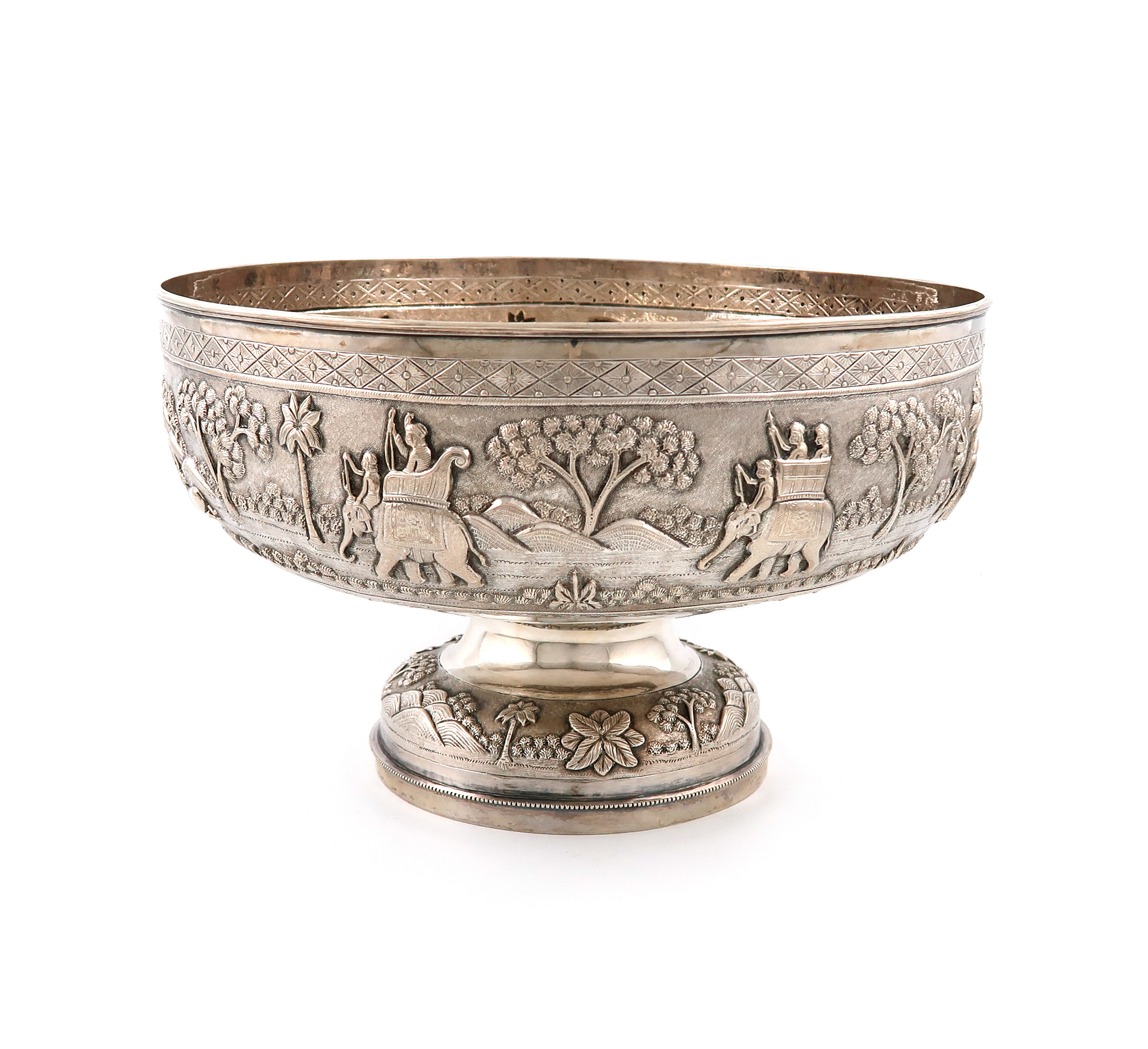 circular form, embossed and chased with elephants, village scenes and animals, on a raised circular foot with foliate decoration, diameter 26.7cm, height 16cm, approx. weight 28.5cm,