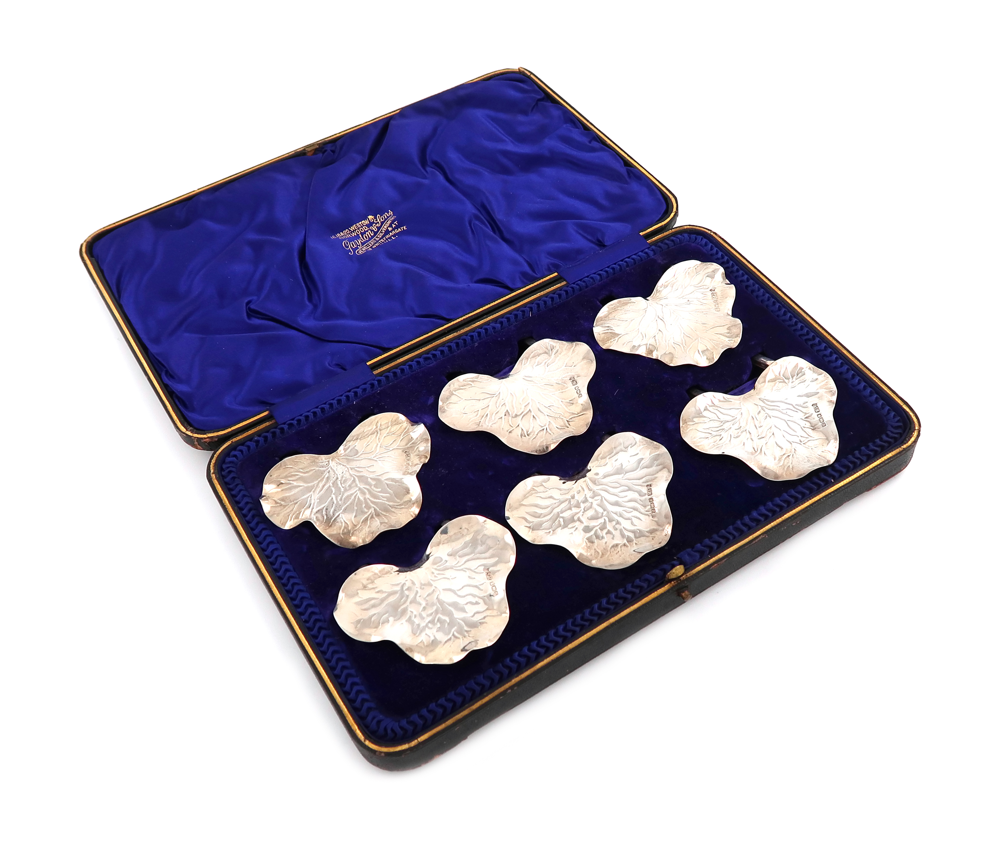 leaf form, with vein decoration, in a fitted case, length 7.5cm, approx. weight 4oz. (6)