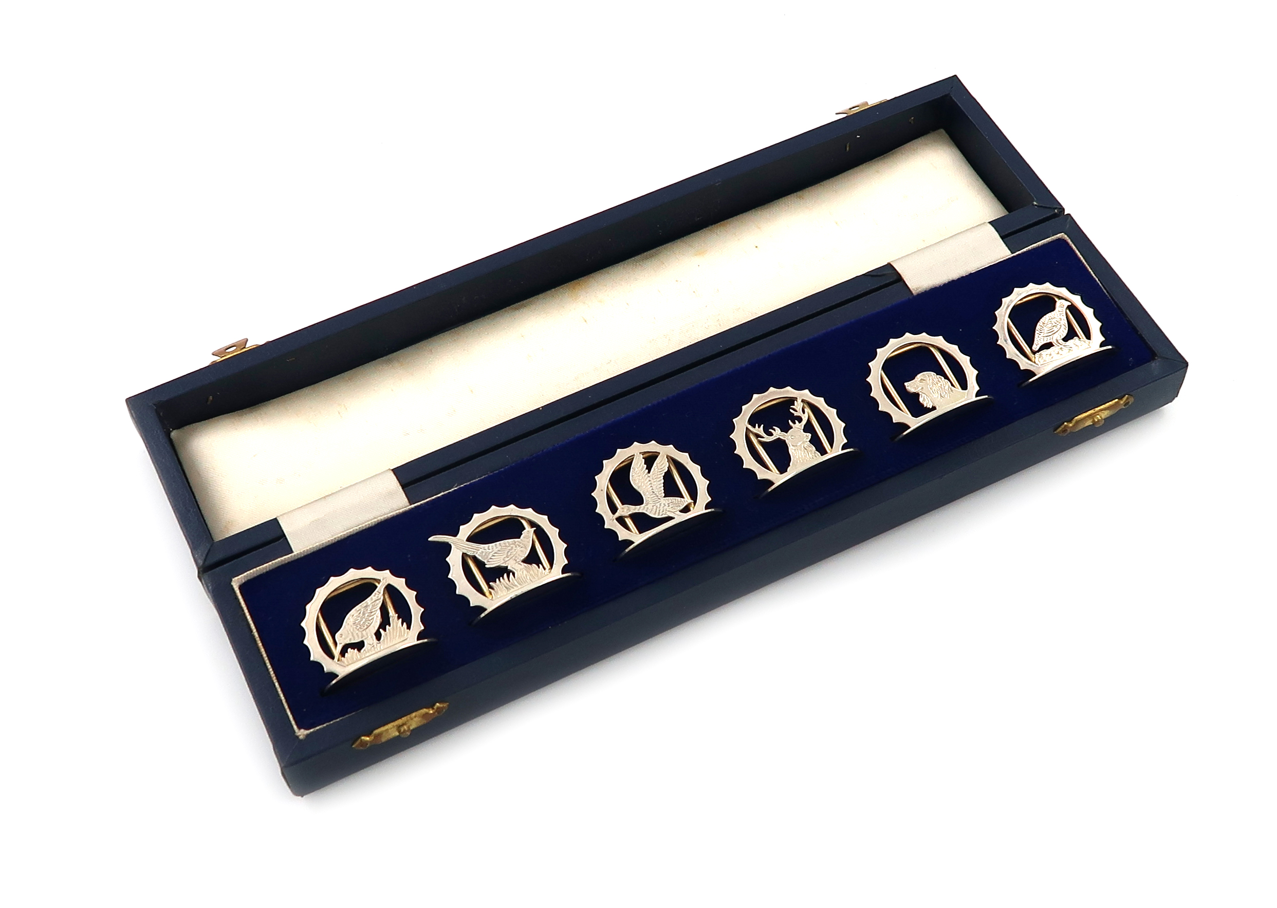 pierced and engraved with game birds, a stag head and a dog head, way-edge circular border, on circular bases, in a fitted case, diameter of base 3cm, approx. weight 2.4oz. (6)