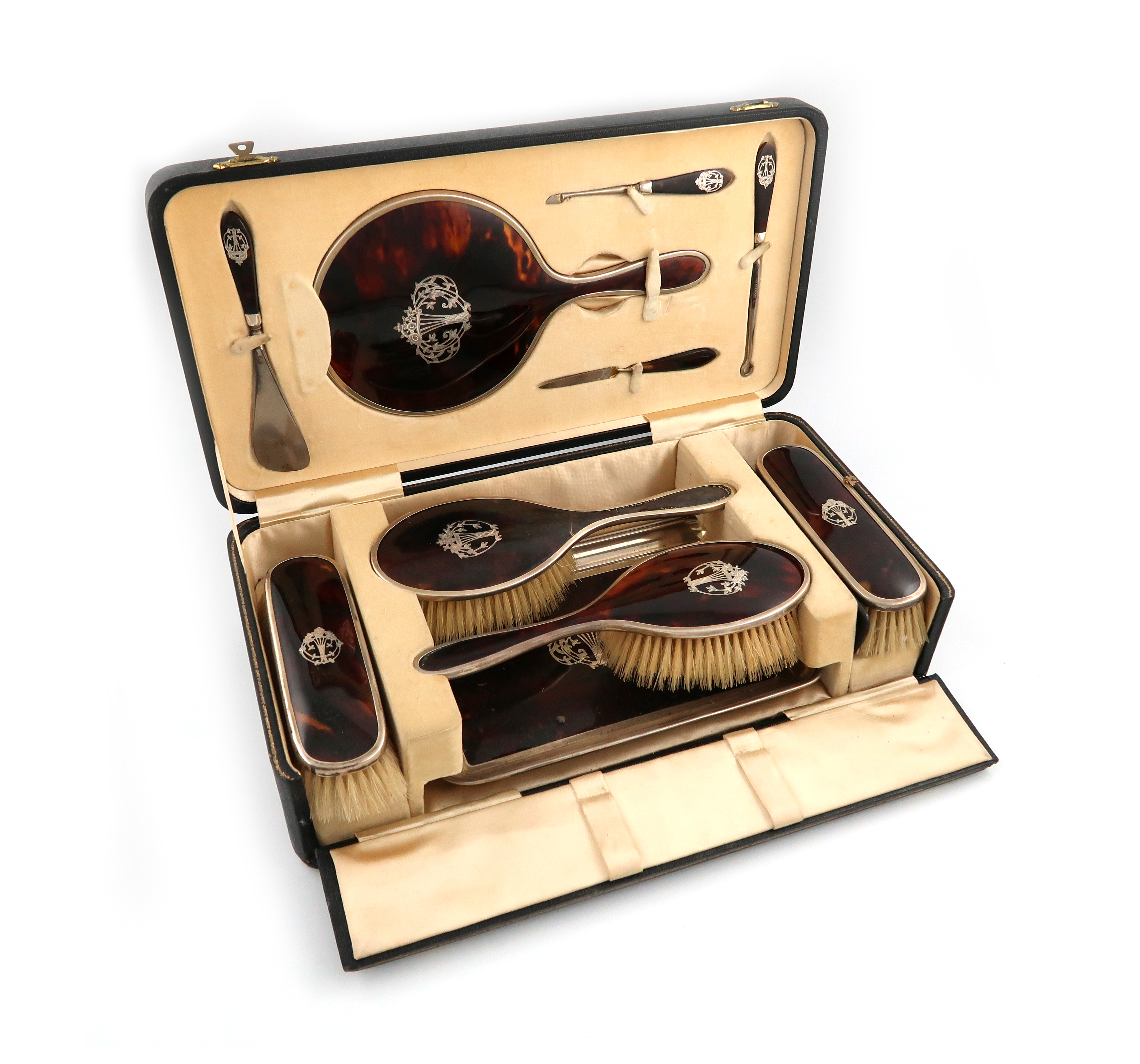 the mounts with traces of gilding, the tortoiseshell with inlaid foliate decoration, comprising: a dressing table tray, a hand mirror, a pair of hairbrushes, a pair of clothes brushes, a shoehorn, a button hook and two manicure items, in a fitted case, hinge a.f.