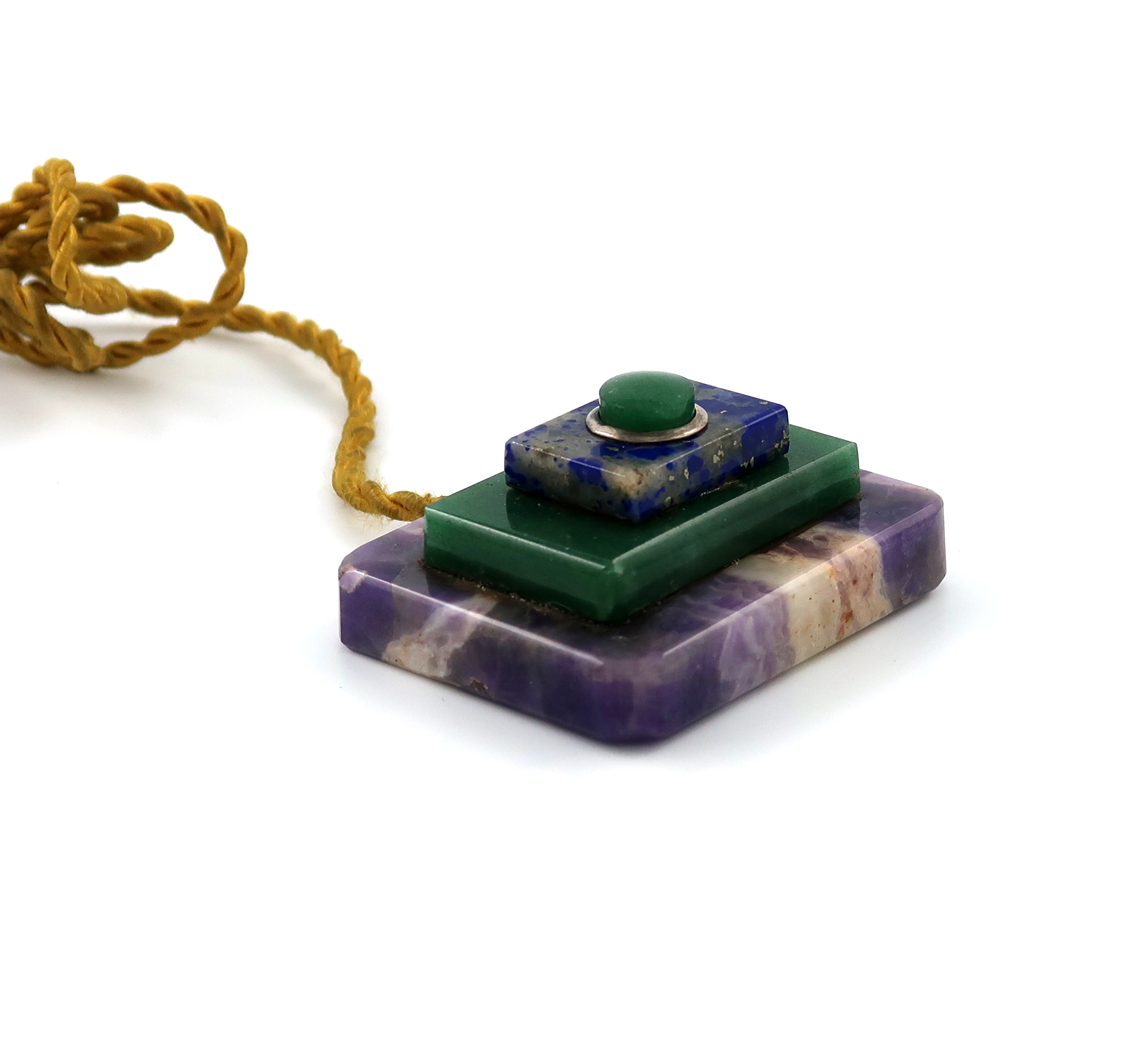 rectangular form, with stepped Lapis Lazuli, Jadeite and Blue John, with a Jadeite push button, length 5.8cm.