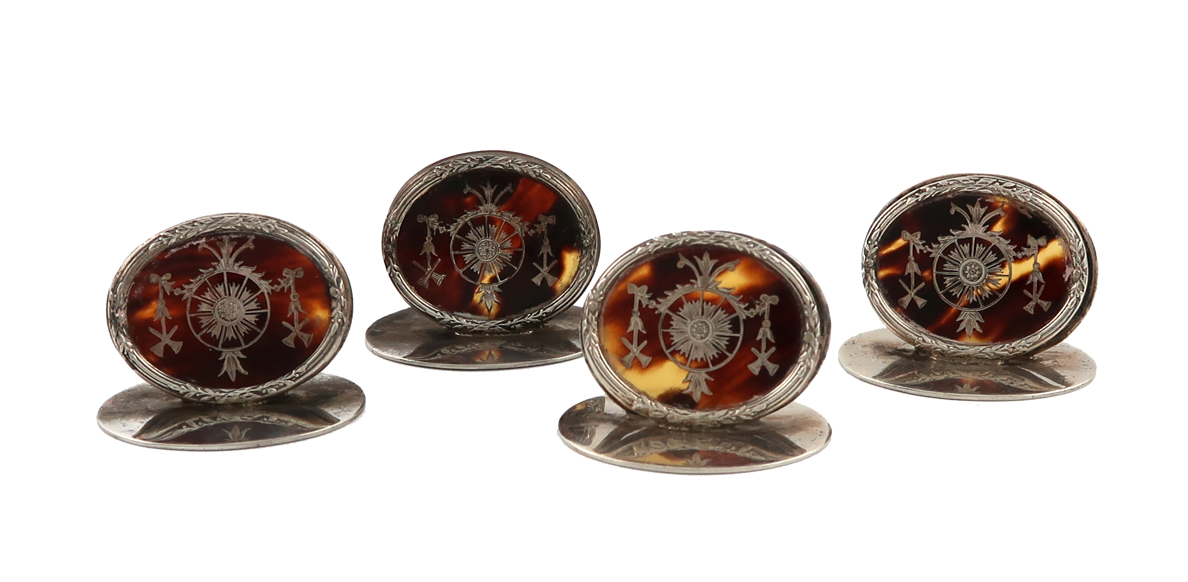 λA set of four Edwardian silver and tortoiseshell menu card holders