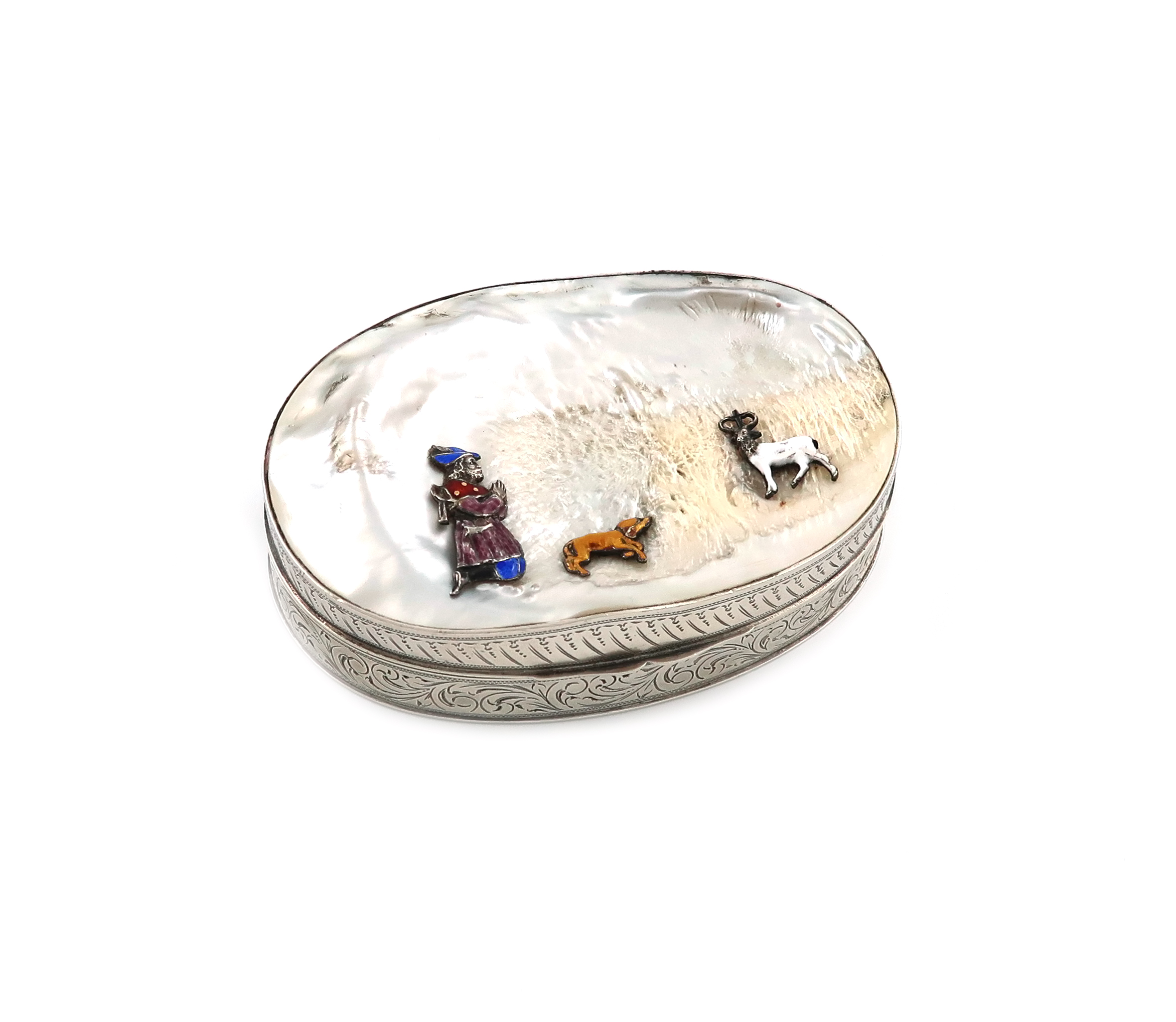 An Austrian silver, enamel and mother-of-pearl snuff box,