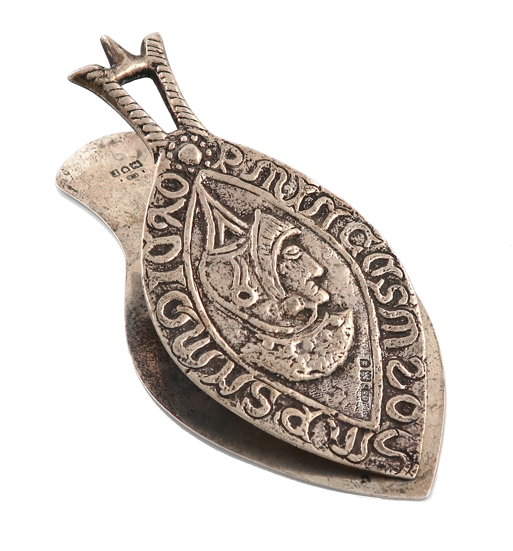 shaped spade form, the sprung hinged cover with a warrior's head in a helmet, with lettering, the underside of the base with a presentation inscription, length of base 13cm, approx. weight 3.1oz.