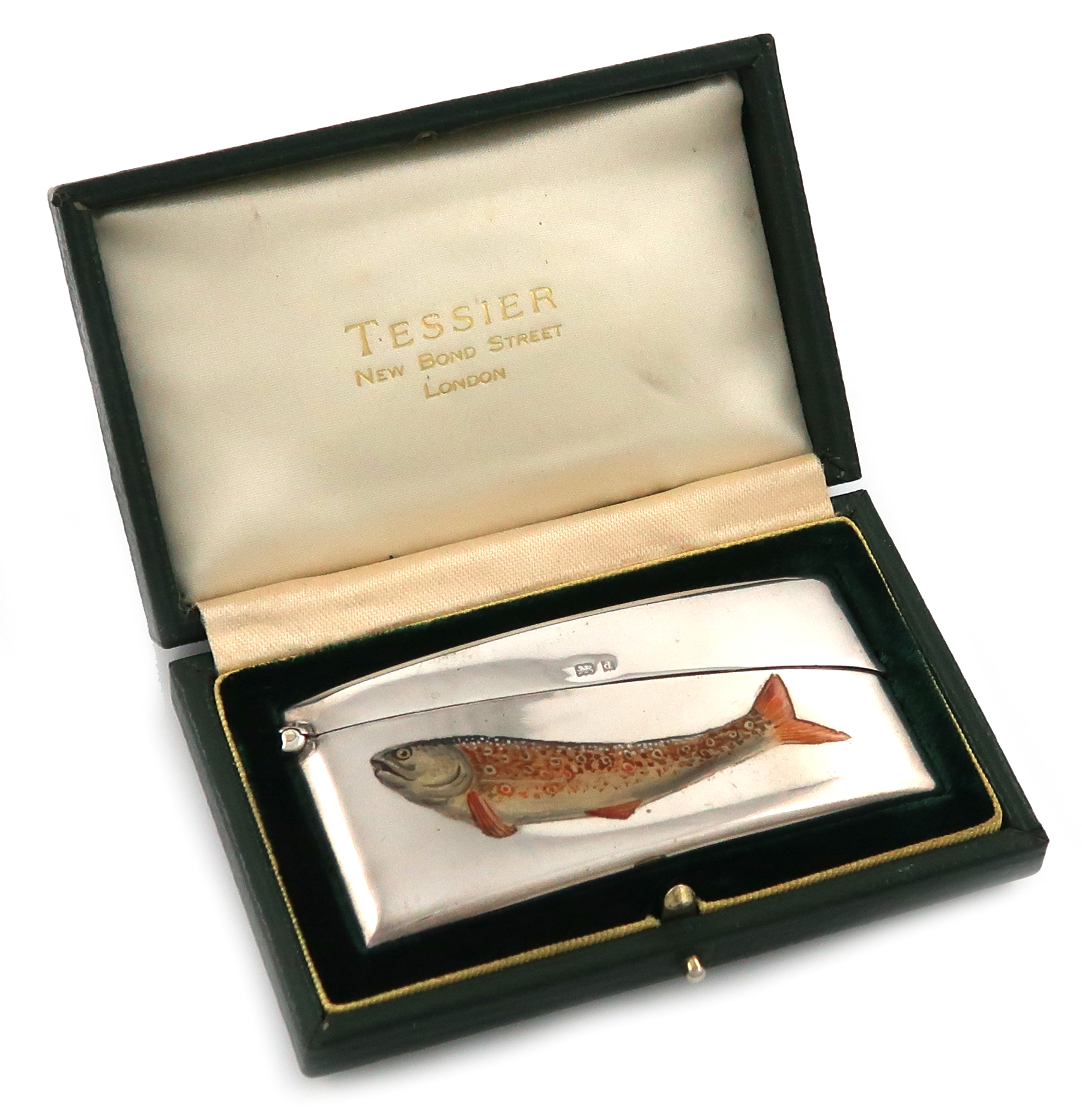shaped rectangular form, hinged cover, the front enamelled with a brown trout, in a later fitted Tessier box, length 8.3cm, approx. weight 1.2oz.