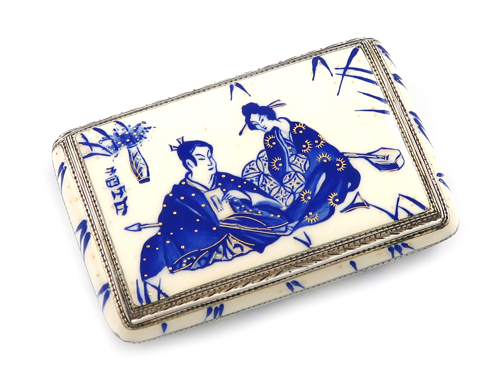 rectangular form, cushion sides, the hinged cover with a figural scene with gilt highlights, the reverse with a bird, engraved borders, gilded interior, length 8.2cm, approx. weight 4oz.