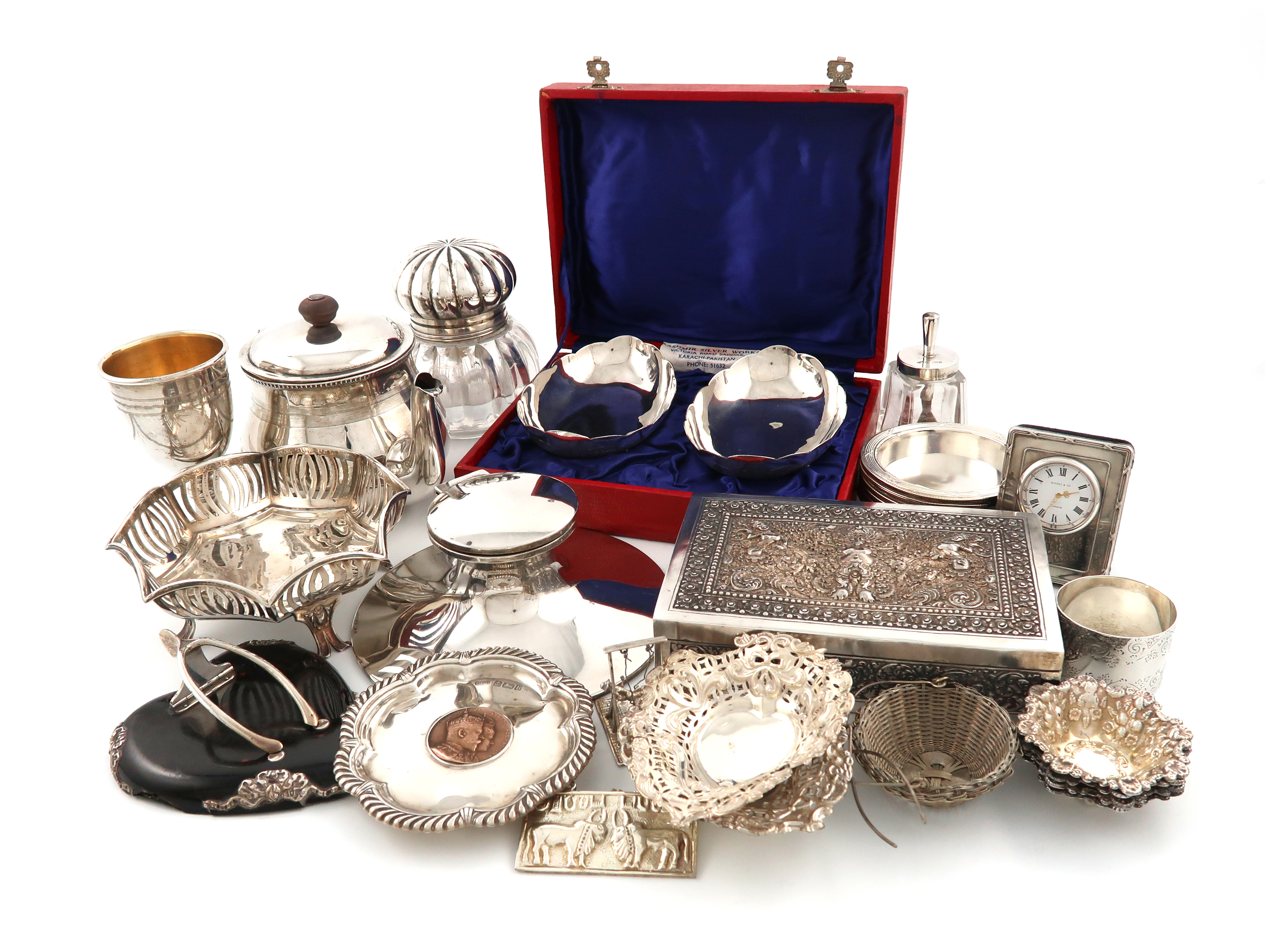 comprising: a Victorian silver-mounted glass inkwell, London 1884, a silver and tortoiseshell wishbone desk clip, London 1899, on a heart-shaped base, a teapot, (lacking handle), a capstan inkwell, a glue pot, a pierced dish, a Kiddish cup, a pair of small dishes, six unmarked circular dishes, a miniature toy of a man on a swing, an ashtray set with a coin, a small modern clock, a set of four small salt cellars and a napkin ring, plus a pair of Pakistani metalware dishes, cased, an Indian/Burmese cigarette box, a medallion and a tea strainer, approx. weighable 24oz. (qty)