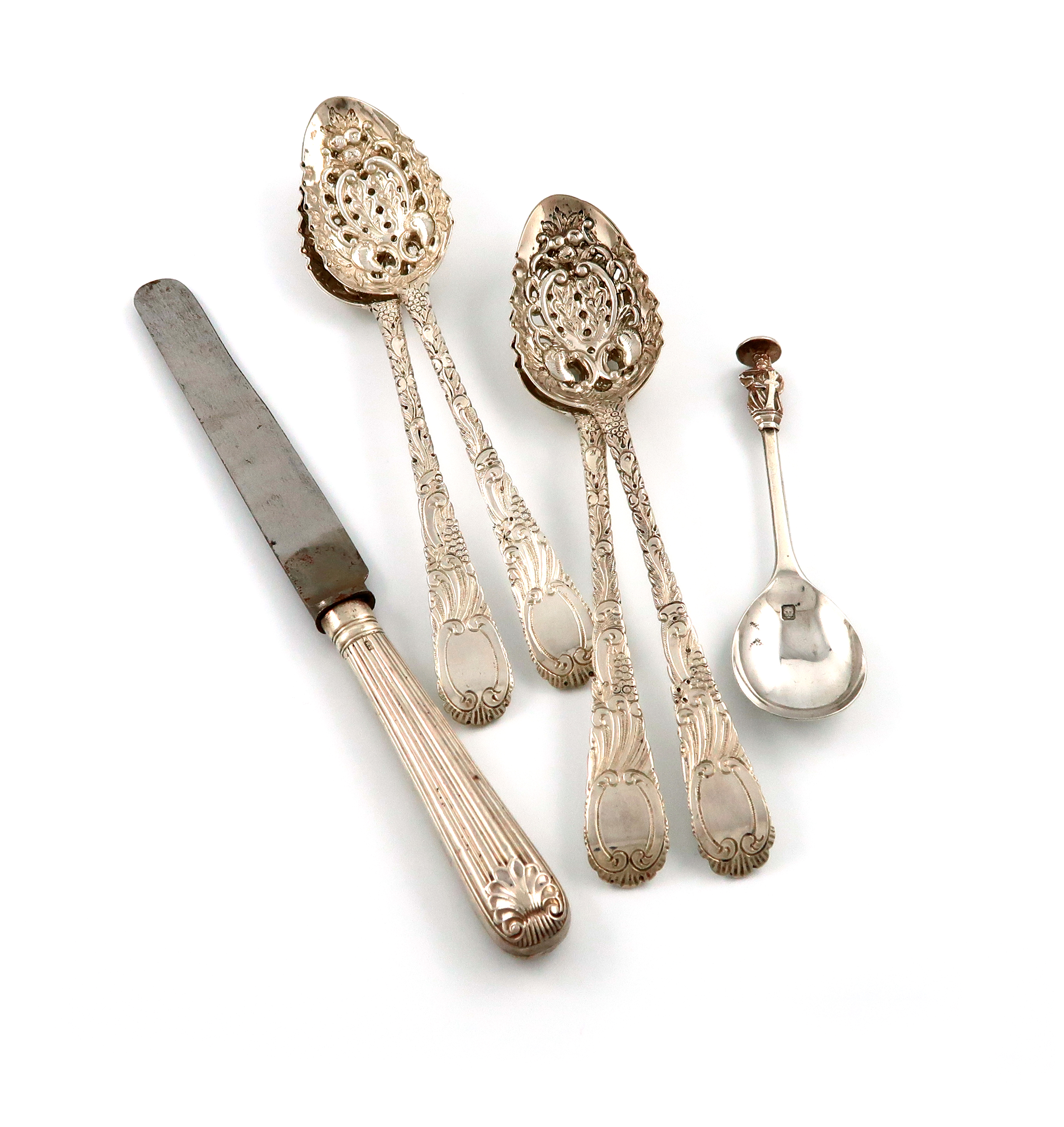 comprising: four George III tablespoons with later pierced and embossed berry and scroll decoration, by George Day, London 1813, plus an Apostle spoon, by T. Bradbury, London 1946, and a Reed and Shell table knife, approx. weighable 9.9oz. (6)