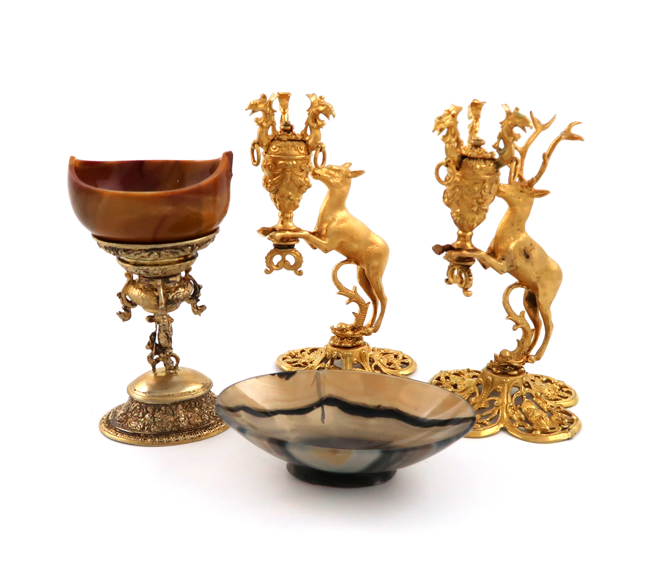 the stem modelled as a classical female supporting an oval bowl holder, on a raised circular foot with mythical beast scroll supports, height 8.2cm, plus a pair of gilt-metal stands modelled as rampant deer holding urns, with a mythical dolphin support, on shaped pierced bases, height 13.2cm, plus two agate dishes. (5)