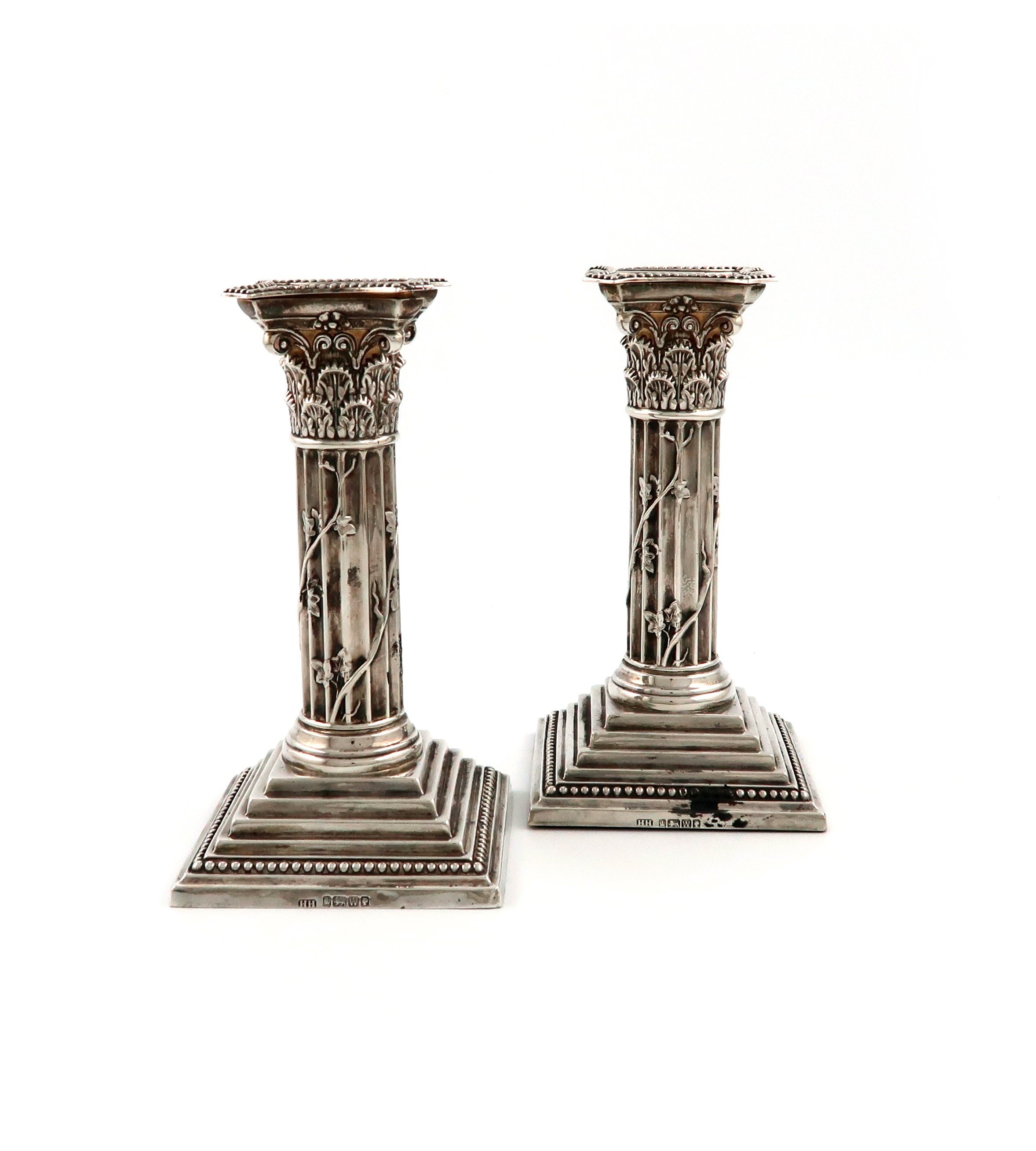 Corinthian column form, with trailing ivy decoration, beaded borders, detachable drip pans, on stepped square bases with beaded borders, height 16.3cm. (2)