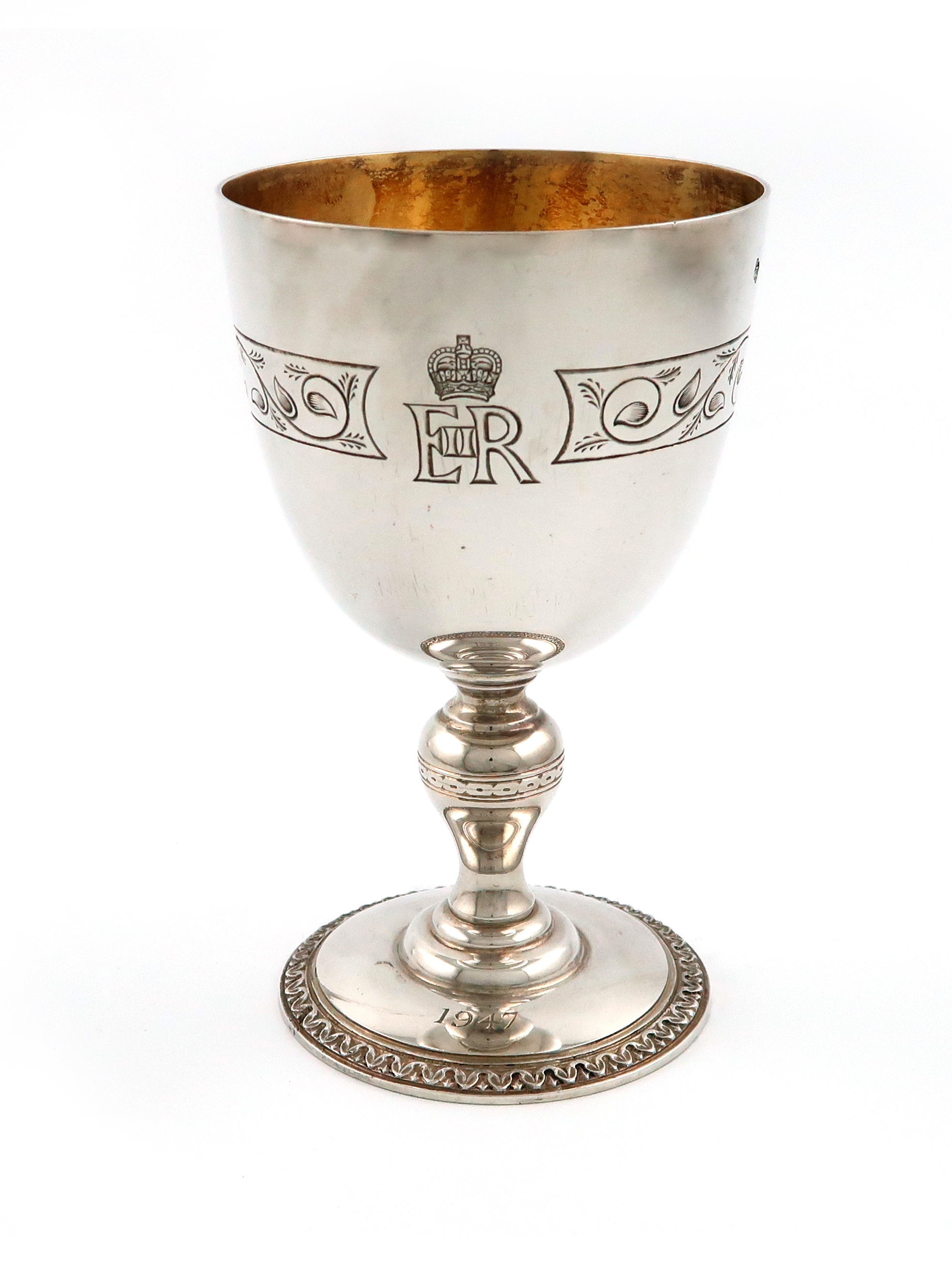 A modern commemorative silver goblet, celebrating the Queen's silver wedding anniversary,