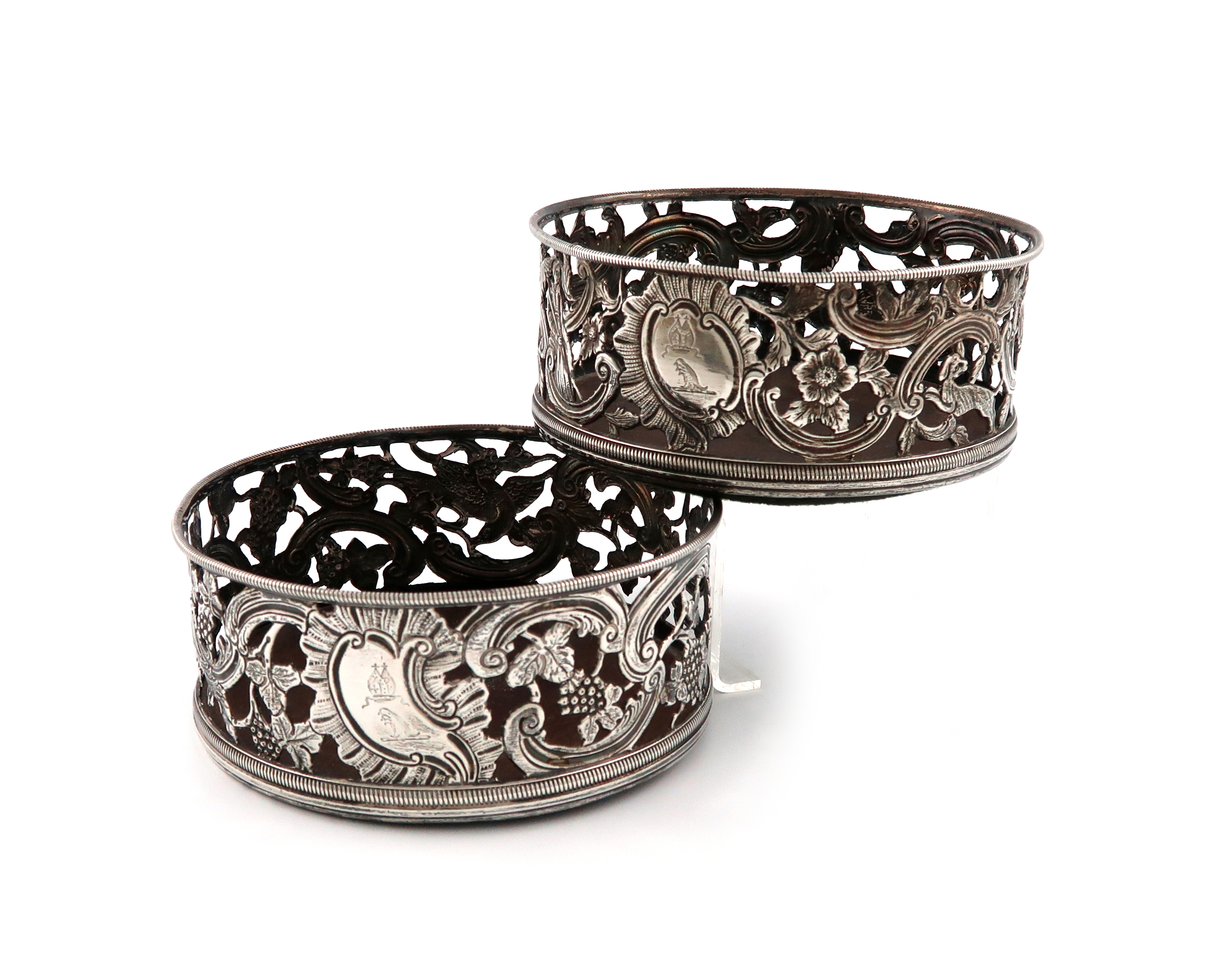 circular form, pierced and embossed with figures, birds and foliate scroll decoration, rope-work borders, wooden bases, engraved with a crest, diameter 14.3cm, height 6.3cm. (2)
