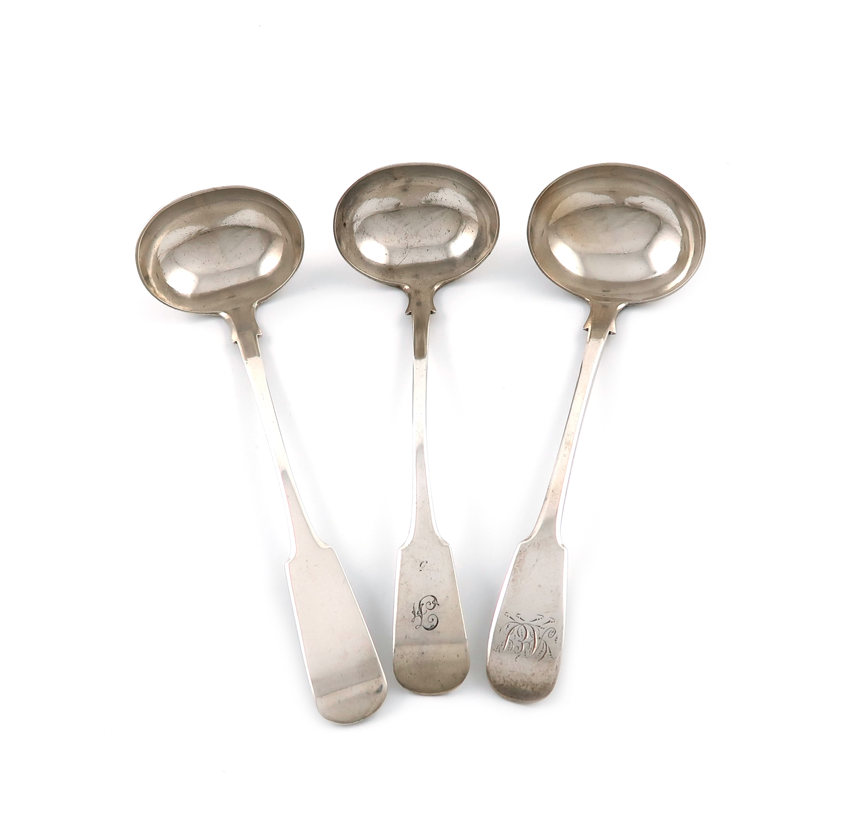 Three 19th century Scottish provincial silver Fiddle pattern toddy ladles,