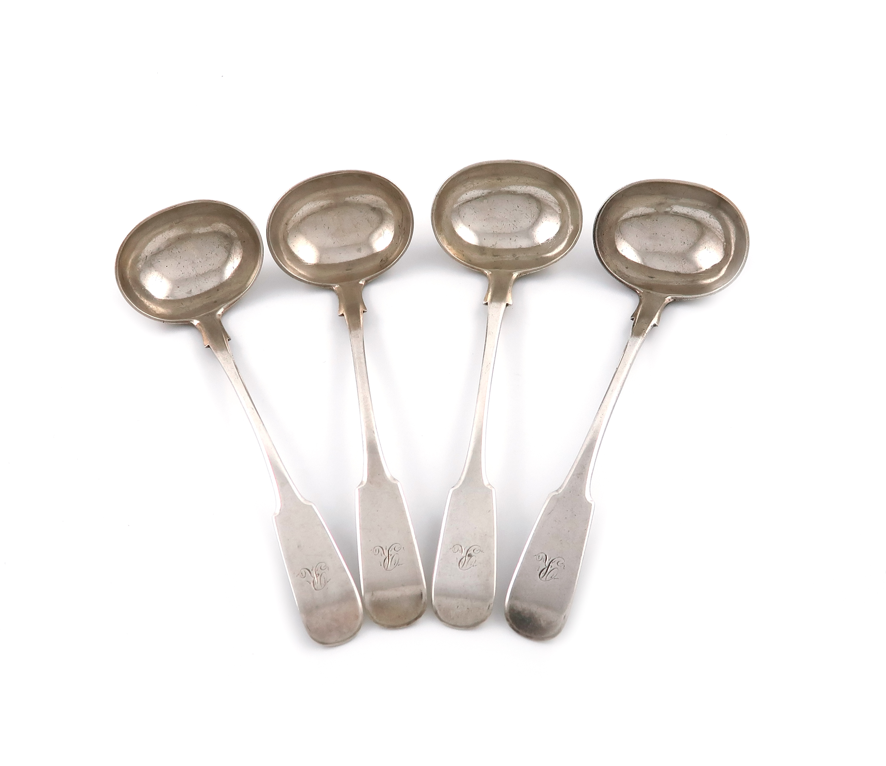 A set of four 19th century Scottish provincial silver Fiddle pattern toddy ladles
