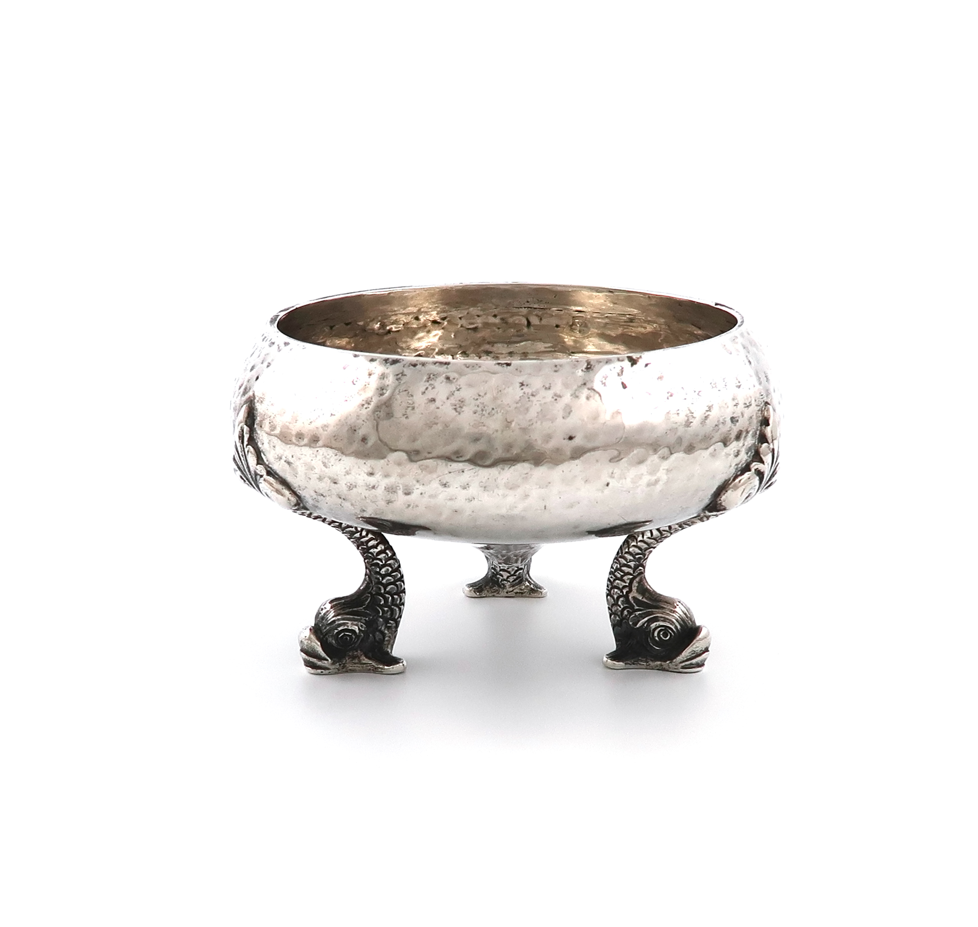 circular form, spot-hammered decoration, on three mythical dolphin feet, height 7cm, approx. weight 5.7oz.