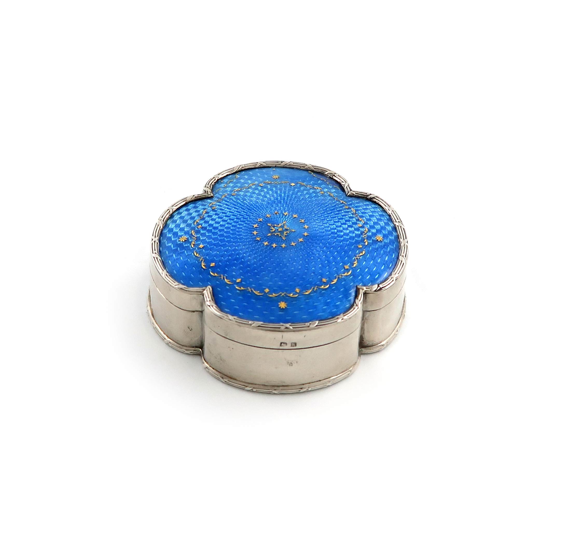 quatrefoil form, the hinged cover with blue enamel decoration, with gilt highlights and stars, the base with a ribbon and reed border, length 6.8cm.